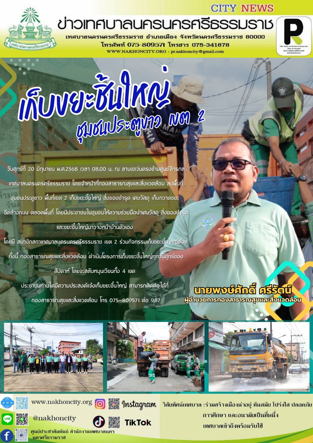 | วันศุกร์ที่ 20 มิถุนายน พ.ศ.2568 เวลา 08.00 น. ณ ลานเซเว่นตรงข้ามศูนย์จักรกล เทศบาลนครนครศรีธรรมราช โดยเจ้าหน้าที่กองสาธารณสุขและสิ่งแวดล้อม ลงพื้นที่ชุมชนประตูขาว พื้นที่เขต 2 เก็บขยะชิ้นใหญ่ สิ่งของชำรุด เศษวัสดุ เก็บกวาดขยะ ฉีดล้างถนน ตลอดพื้นที่ โดยมีประชาชนในชุมชนให้ความร่วมมือนำเศษวัสดุ สิ่งของชำรุด และขยะชิ้นใหญ่มาวางหน้าบ้านตัวเอง โดยมี สมาชิกสภาเทศบาลนครนครศรีธรรมราช เขต 2 ร่วมกิจกรรมเก็บขยะชิ้นใหญ่ด้วย ทั้งนี้ กองสาธารณสุขและสิ่งแวดล้อม ดำเนินโครงการเก็บขยะชิ้นใหญ่ทุกวันศุกร์ของสัปดาห์ โดยจะสลับหมุนเวียนทั้ง 4 เขต ประชาชนท่านใดมีความประสงค์แจ้งเก็บขยะชิ้นใหญ่ สามารถ ติดต่อได้ที่ กองสาธารณสุขและสิ่งแวดล้อม โทร 075-809571 ต่อ 9117 ............... ภาพ//ข่าว//จันทร์จิรา ตรวจทาน//ฐิตินันท์ |