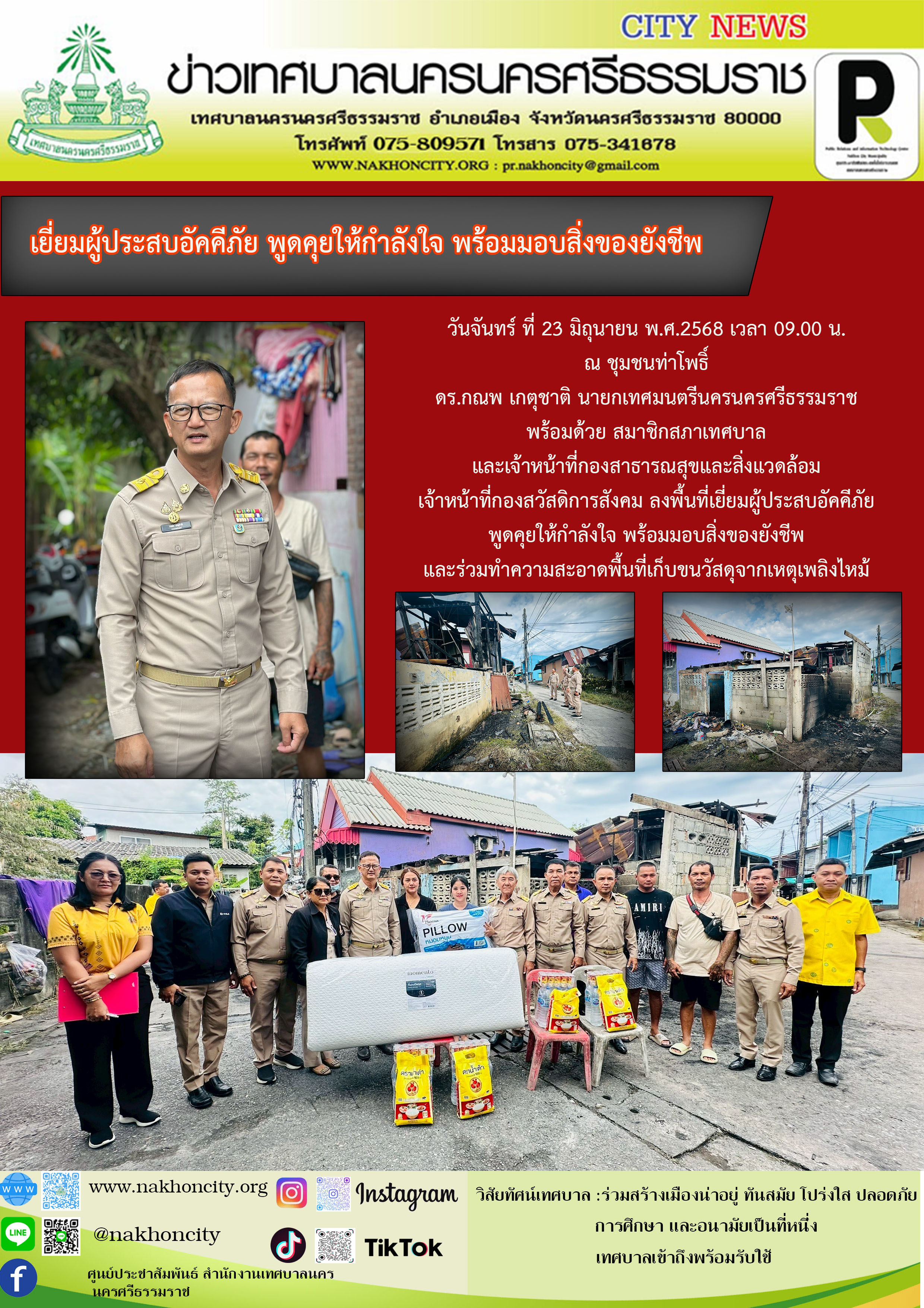 | นายกเทศมนตรีนครนครศรีธรรมราช ลงพื้นที่เยี่ยมผู้ประสบอัคคีภัย พูดคุยให้กำลังใจ พร้อมมอบสิ่งของยังชีพ และร่วมทำความสะอาดพื้นที่เก็บขนวัสดุจากเหตุเพลิงไหม้ |