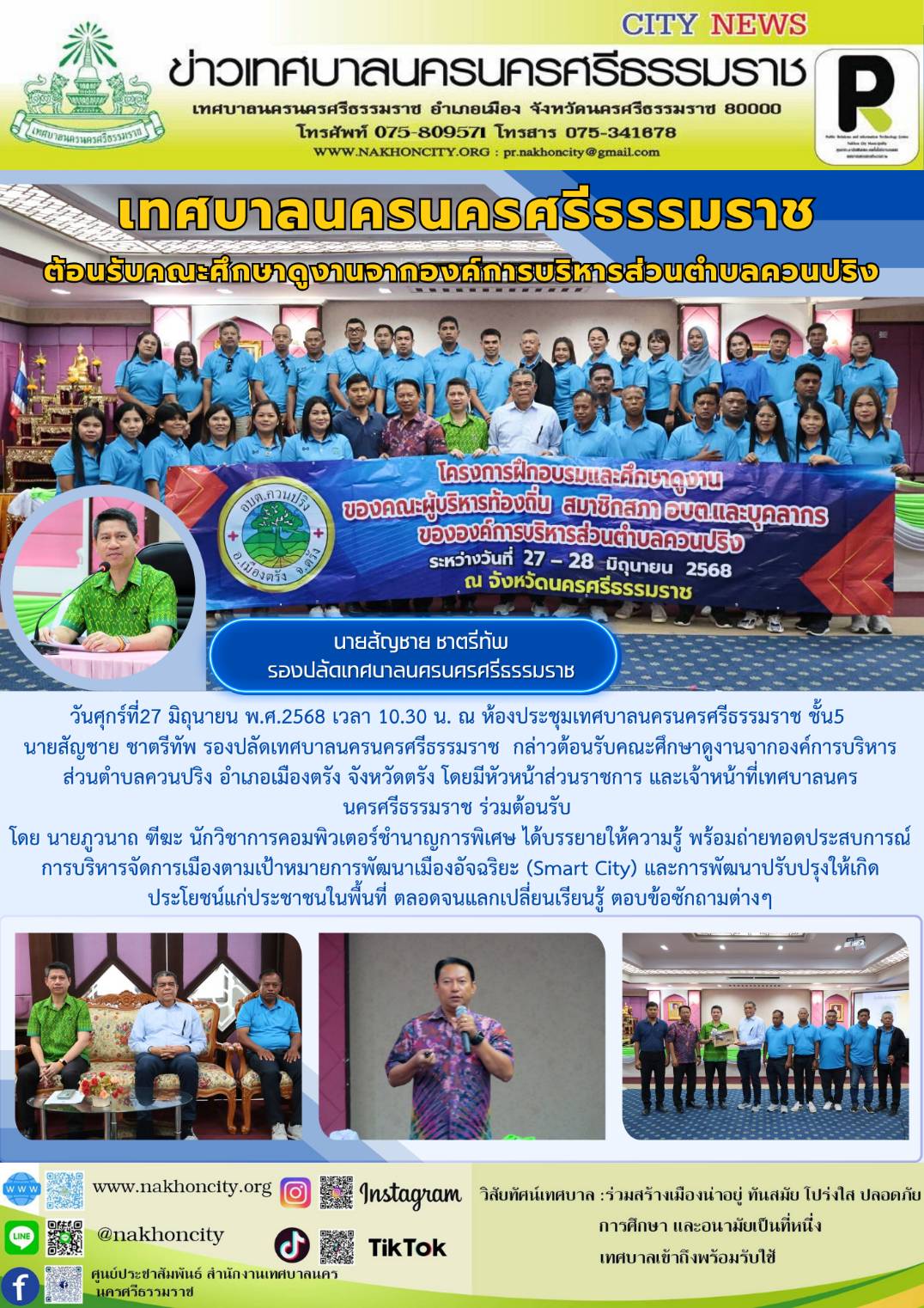| วันศุกร์ที่27 มิถุนายน พ.ศ.2568 เวลา 10.30 น. ณ ห้องประชุมเทศบาลนครนครศรีธรรมราช ชั้น5 นายสัญชาย ชาตรีทัพ รองปลัดเทศบาลนครนครศรีธรรมราช  กล่าวต้อนรับคณะศึกษาดูงานจากองค์การบริหารส่วนตำบลควนปริง อำเภอเมืองตรัง จังหวัดตรัง โดยมีหัวหน้าส่วนราชการ และเจ้าหน้าที่เทศบาลนครนครศรีธรรมราช ร่วมต้อนรับ  |