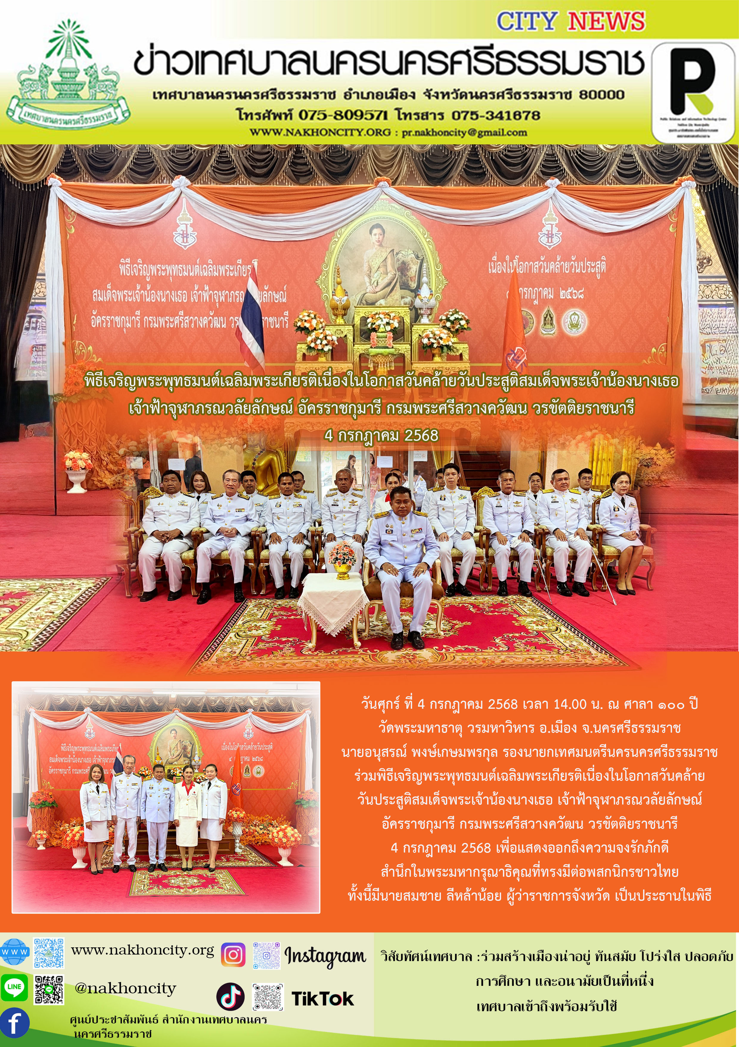 | รองนายกเทศมนตรีนครนครศรีธรรมราช ร่วมพิธีเจริญพระพุทธมนต์เฉลิมพระเกียรติเนื่องในโอกาสวันคล้ายวันประสูติ สมเด็จพระเจ้าน้องนางเธอ เจ้าฟ้าจุฬาภรณวลัยลักษณ์ อัครราชกุมารี กรมพระศรีสวางควัฒน วรขัตติยราชนารี 4 กรกฎาคม 2568 |