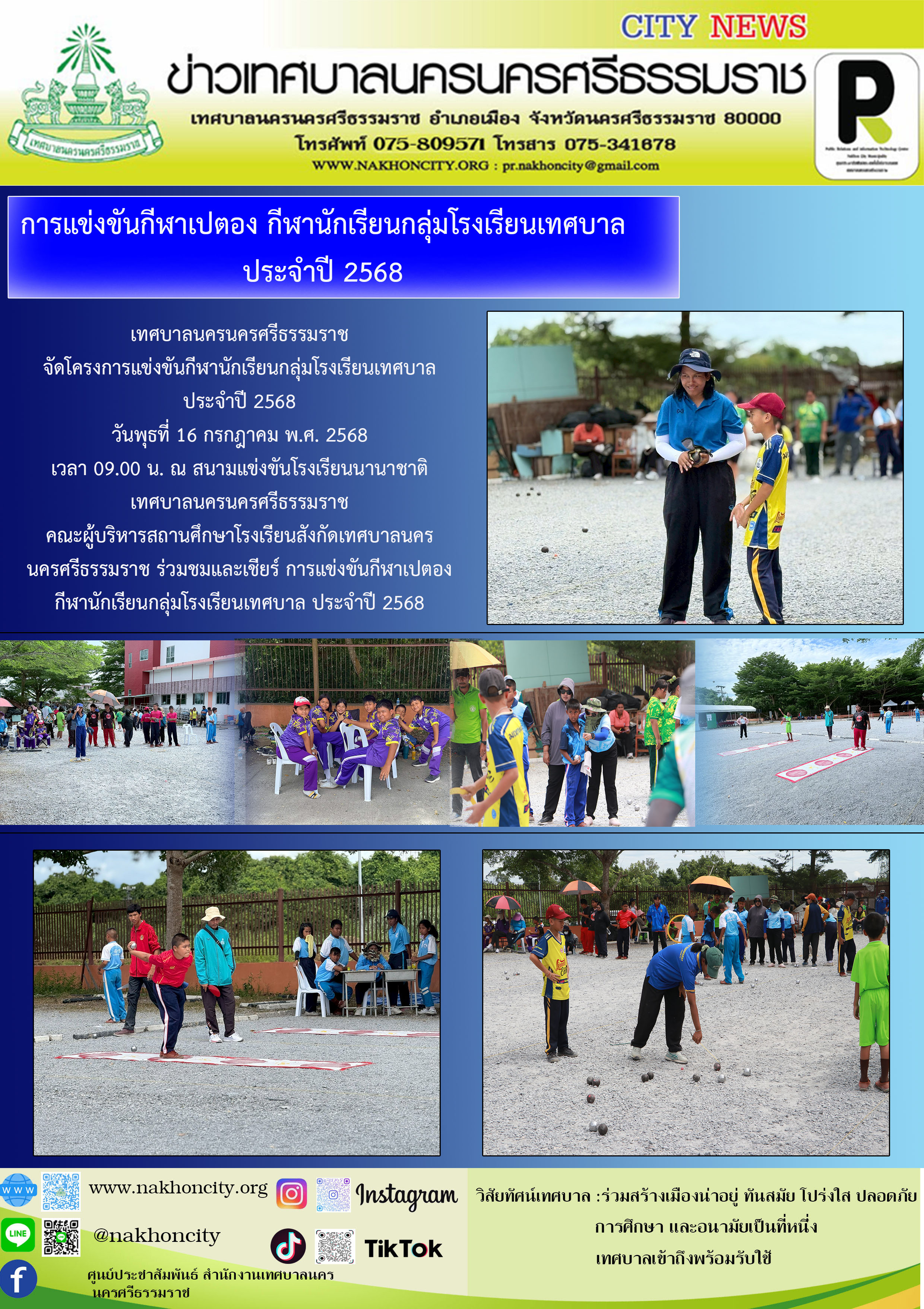 | เทศบาลนครนครศรีธรรมราช จัดโครงการแข่งขันกีฬานักเรียนกลุ่มโรงเรียนเทศบาล ประจำปี 2568 วันพุธที่ 16 กรกฎาคม พ.ศ. 2568 เวลา 09.00 น. ณ สนามแข่งขันโรงเรียนนานาชาติ เทศบาลนครนครศรีธรรมราช คณะผู้บริหารสถานศึกษาโรงเรียนสังกัดเทศบาลนคร นครศรีธรรมราช ร่วมชมและเชียร์ การแข่งขันกีฬาเปตอง กีฬานักเรียนกลุ่มโรงเรียนเทศบาล ประจำปี 2568 |