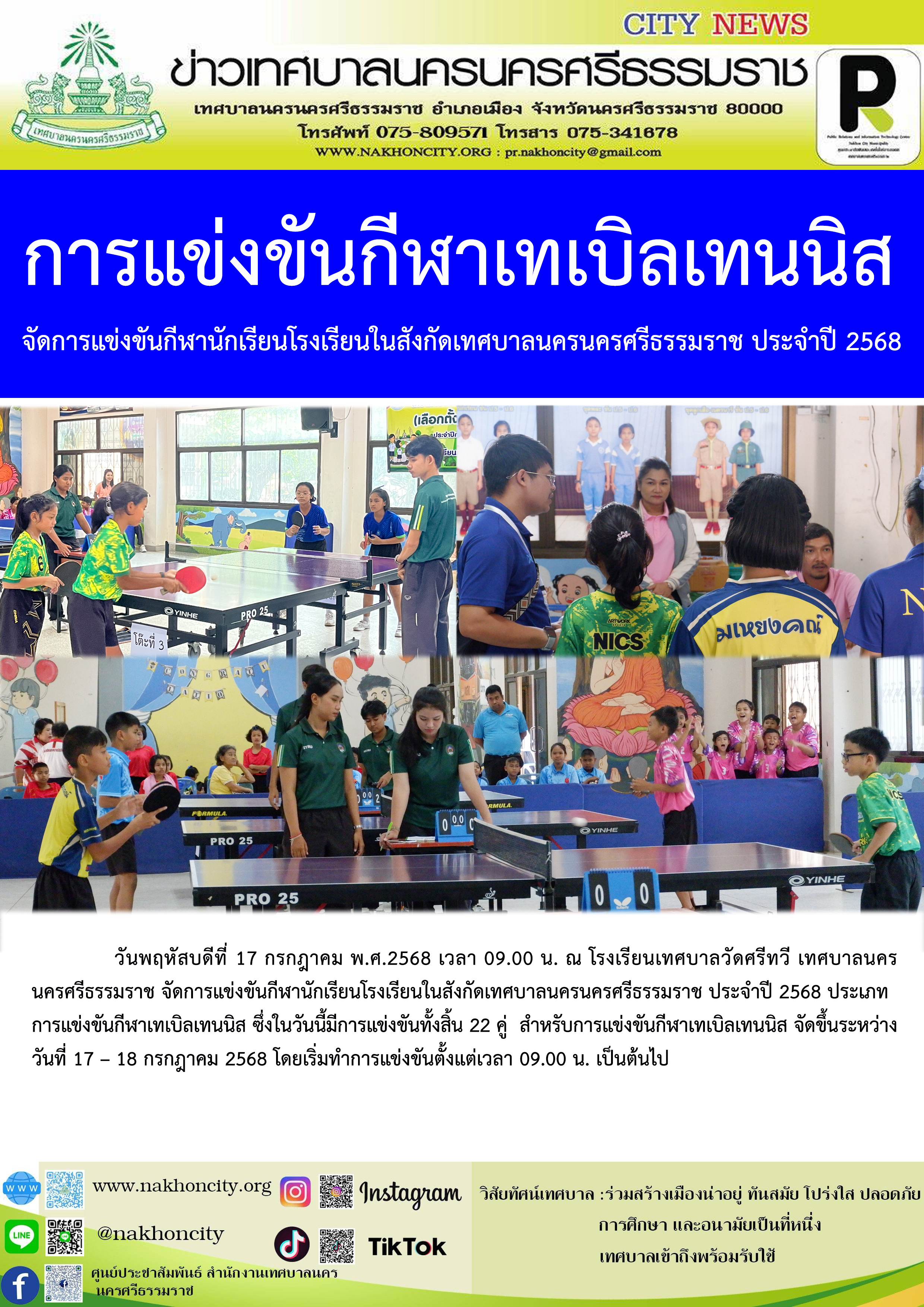 | การแข่งขันกีฬาเทเบิลเทนนิส ในจัดการแข่งขันกีฬานักเรียนโรงเรียนในสังกัดเทศบาลนครนครศรีธรรมราช ประจำปี 2568 |