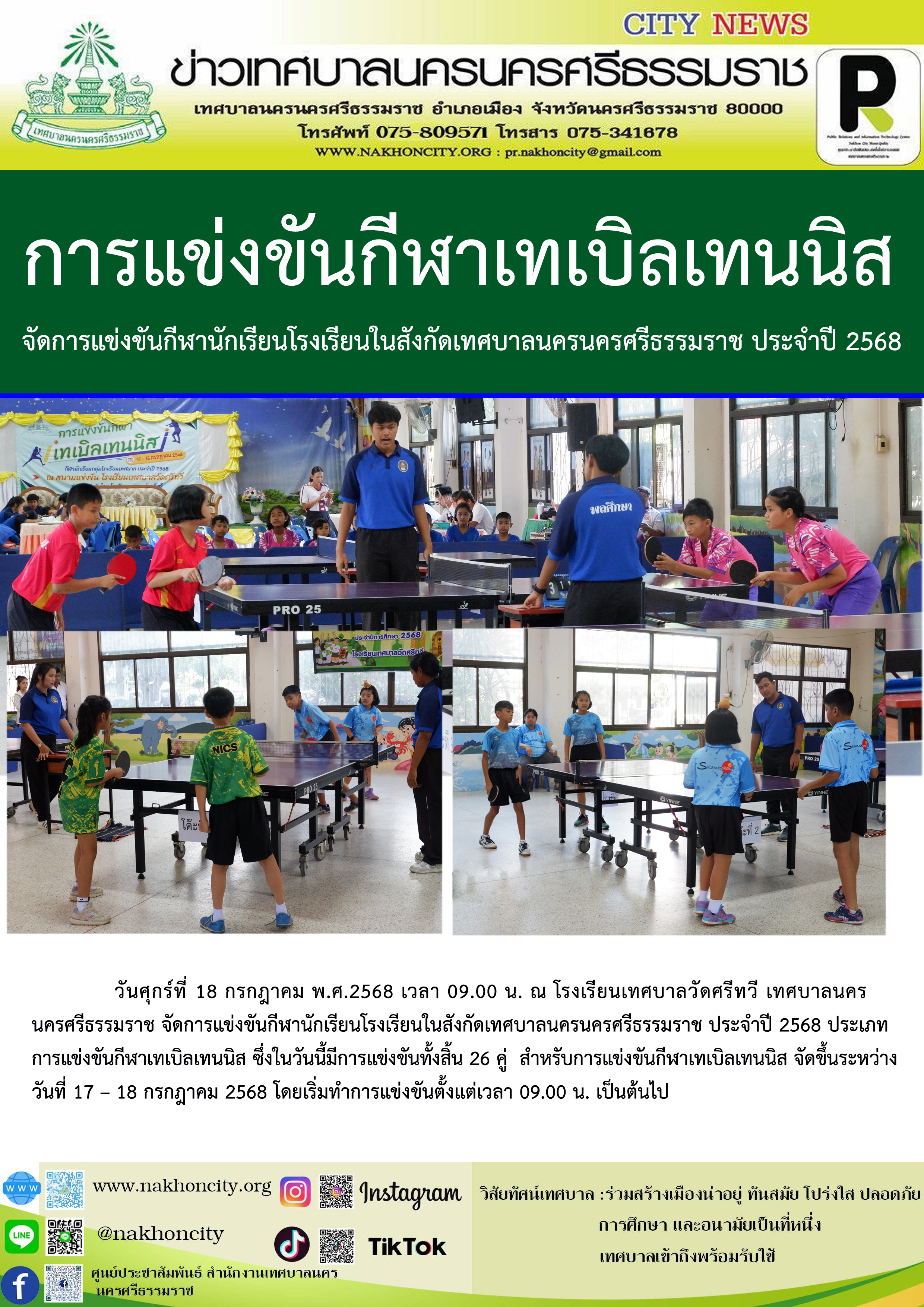 | การแข่งขันกีฬาเทเบิลเทนนิส ในจัดการแข่งขันกีฬานักเรียนโรงเรียนในสังกัดเทศบาลนครนครศรีธรรมราช ประจำปี 2568 |