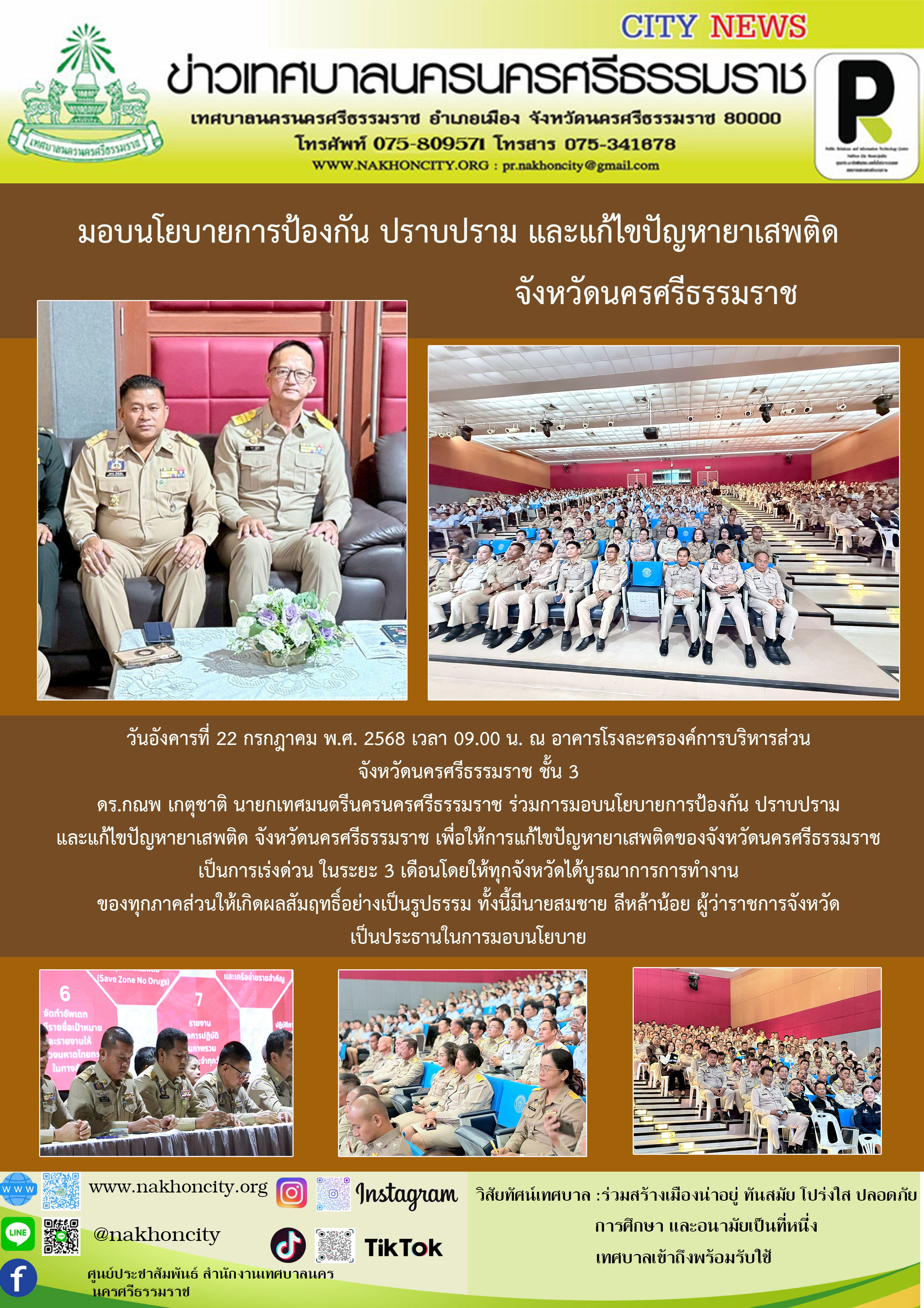 | นายกเทศมนตรีนครนครศรีธรรมราช ร่วมการมอบนโยบายการป้องกัน ปราบปราม และแก้ไขปัญหายาเสพติด จังหวัดนครศรีธรรมราช |