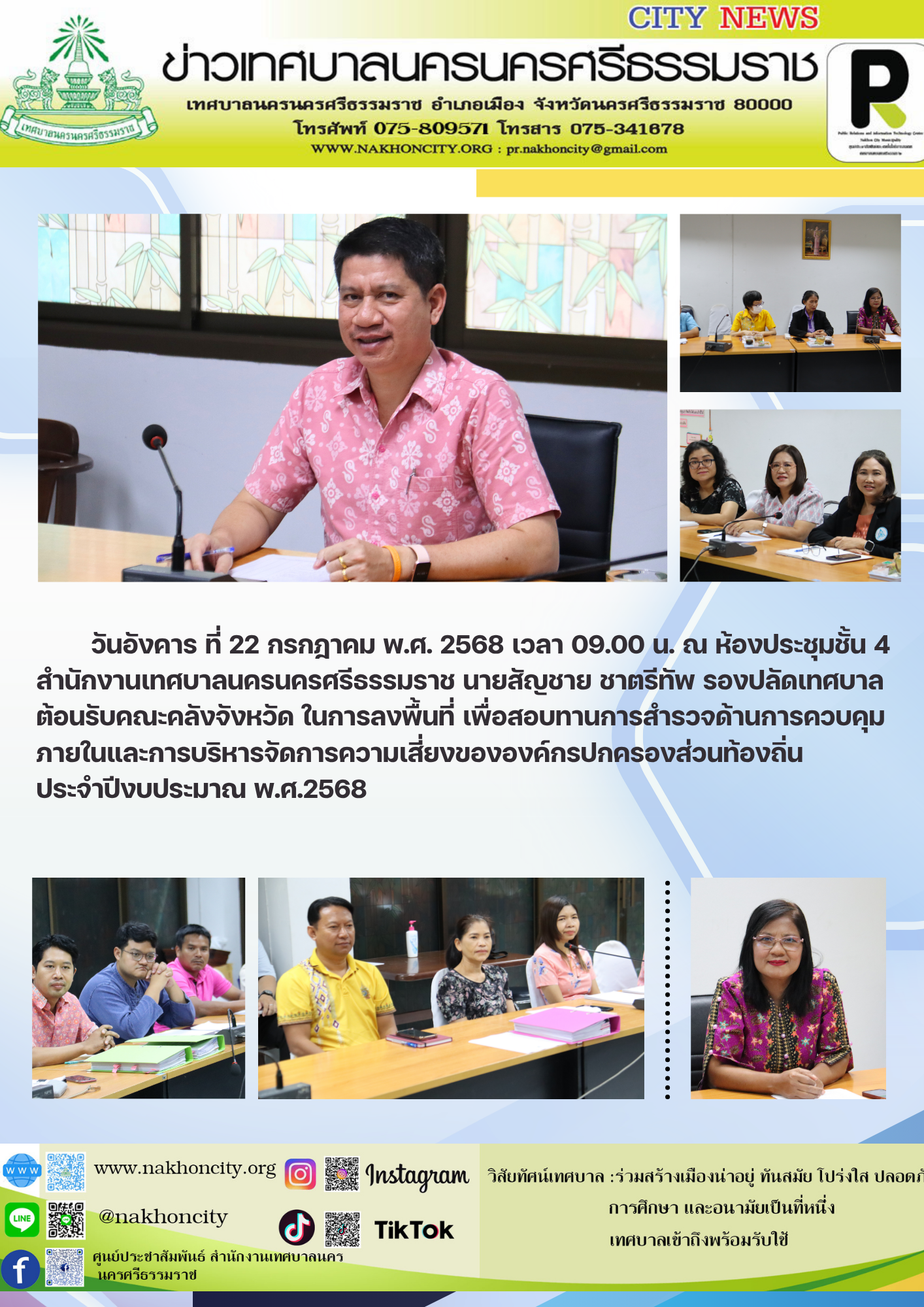| วันอังคารที่ 22 กรกฎาคม พ.ศ. 2568 เวลา 09.00 น. ณ ห้องประชุมชั้น 4 สำนักงานเทศบาลนครนครศรีธรรมราช นายสัญชาย ชาตรีทัพ รองปลัดเทศบาล ต้อนรับคณะคลังจังหวัด ในการลงพื้นที่ เพื่อสอบทานการสำรวจด้านการควบคุมภายในและการบริหารจัดการความเสี่ยงขององค์กรปกครองส่วนท้องถิ่น ประจำปีงบประมาณ พ.ศ.2568