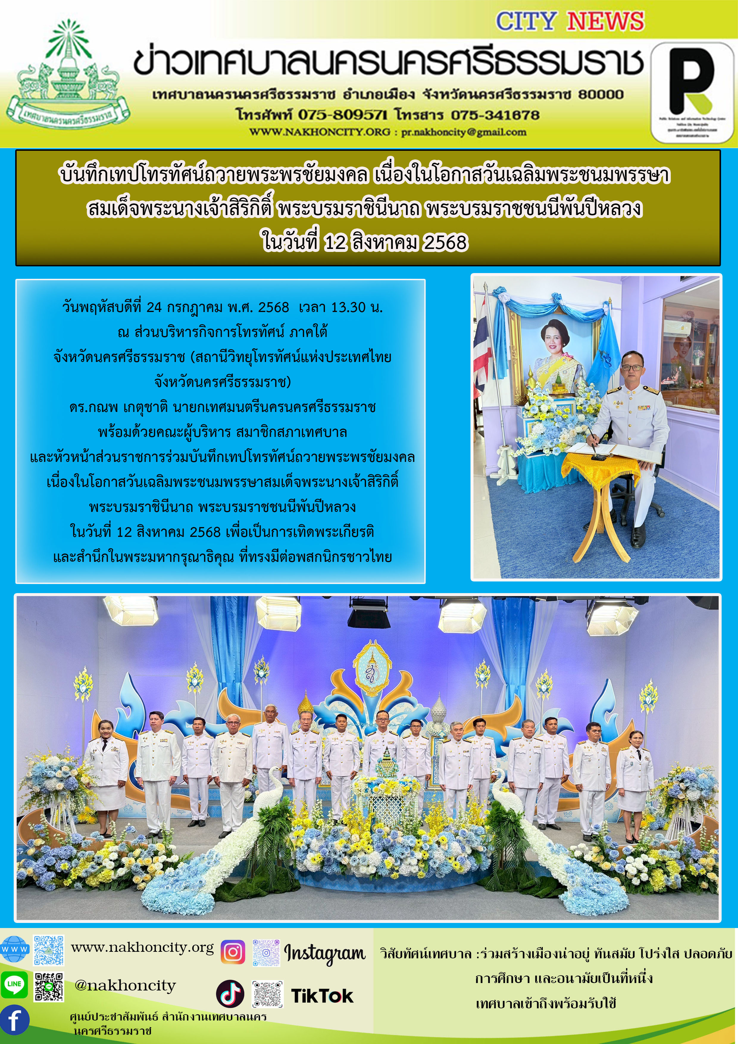 | นายกเทศมนตรีนครนครศรีธรรมราช พร้อมด้วยคณะผู้บริหาร สมาชิกสภาเทศบาล และหัวหน้าส่วนราชการร่วมบันทึกเทปโทรทัศน์ถวายพระพรชัยมงคล เนื่องในโอกาสวันเฉลิมพระชนมพรรษาสมเด็จพระนางเจ้าสิริกิติ์ พระบรมราชินีนาถ พระบรมราชชนนีพันปีหลวง ในวันที่ 12 สิงหาคม 2568 |