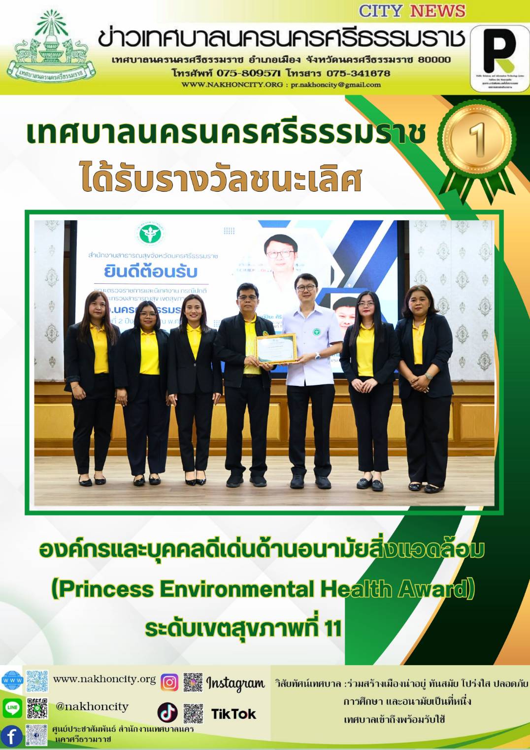 | เทศบาลนครนครศรีธรรมราช ได้รับรางวัลชนะเลิศองค์กรและบุคคลดีเด่นด้านอนามัยสิ่งแวดล้อม (Princess Environmental Health Award) ระดับเขตสุขภาพที่ 11 |