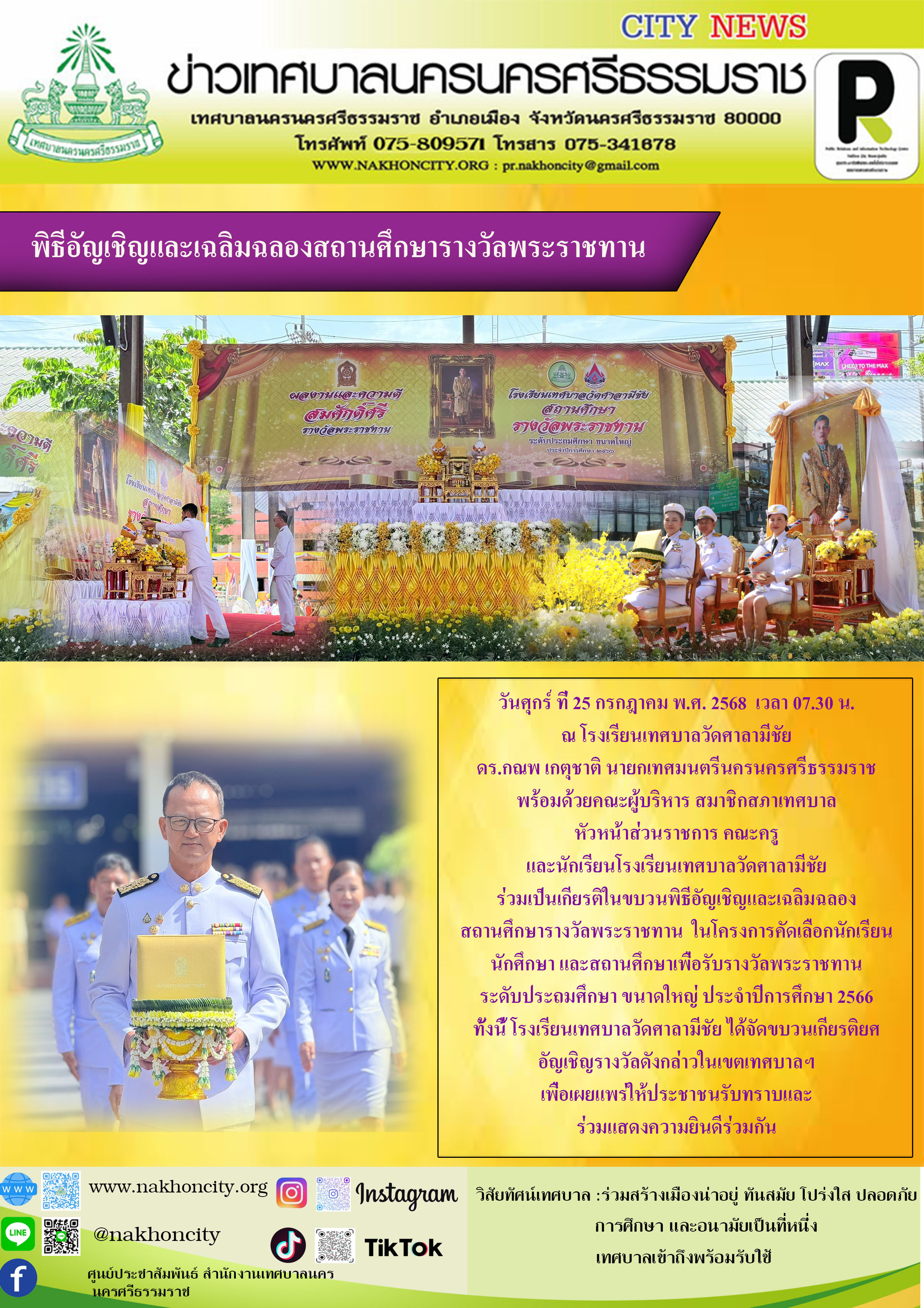 | นายกเทศมนตรีนครนครศรีธรรมราช พร้อมด้วยคณะผู้บริหาร สมาชิกสภาเทศบาล หัวหน้าส่วนราชการ คณะครู และนักเรียนโรงเรียนเทศบาลวัดศาลามีชัย ร่วมเป็นเกียรติในขบวนพิธีอัญเชิญและเฉลิมฉลองสถานศึกษารางวัลพระราชทาน ในโครงการคัดเลือกนักเรียน นักศึกษา และสถานศึกษาเพื่อรับรางวัลพระราชทาน ระดับประถมศึกษา ขนาดใหญ่ ประจำปีการศึกษา 2566 |