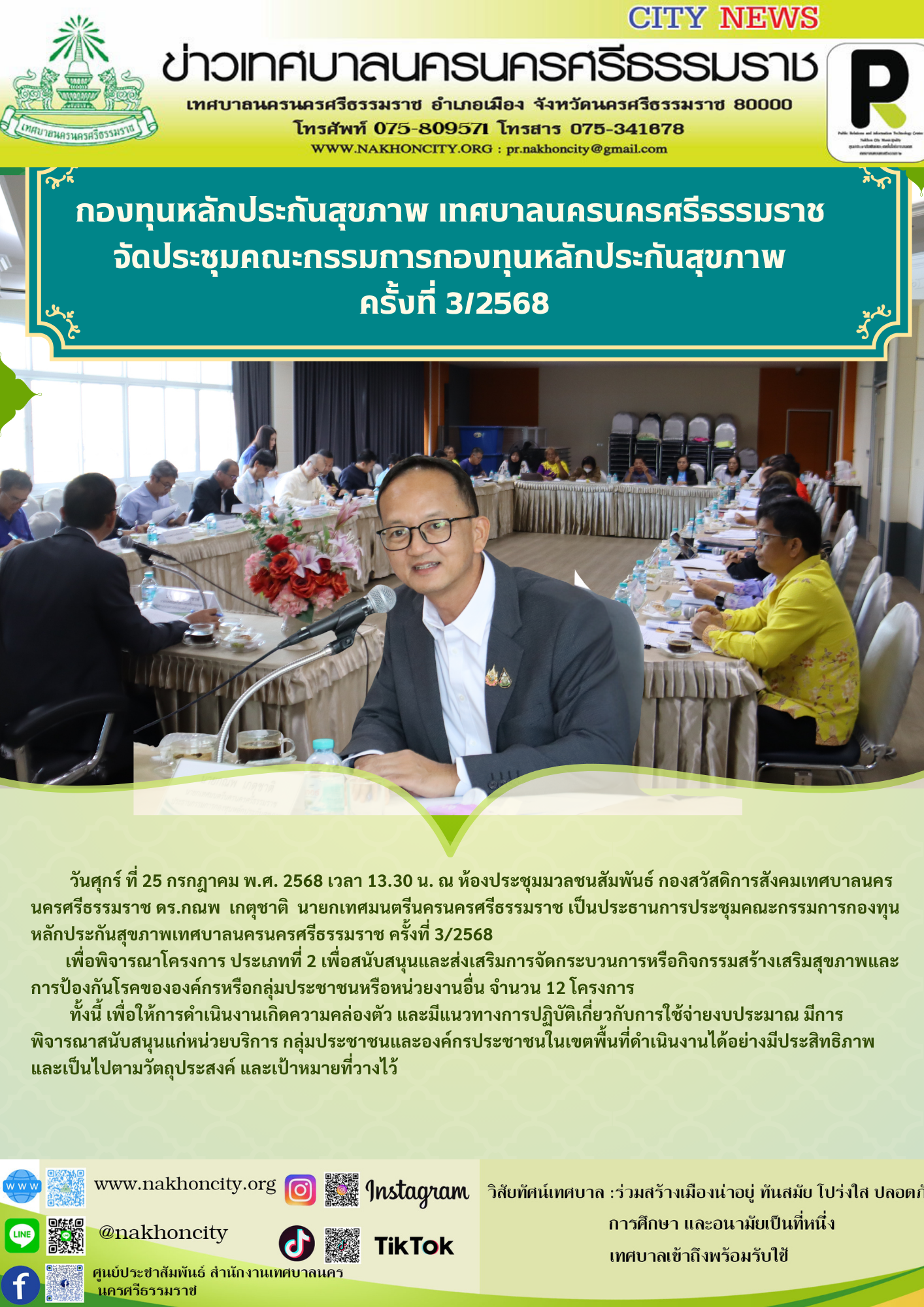 | ดร.กณพ เกตุชาติ นายกเทศมนตรีนครนครศรีธรรมราช เป็นประธานการประชุมคณะกรรมการกองทุนหลักประกันสุขภาพเทศบาลนครนครศรีธรรมราช ครั้งที่ 3/2568 |