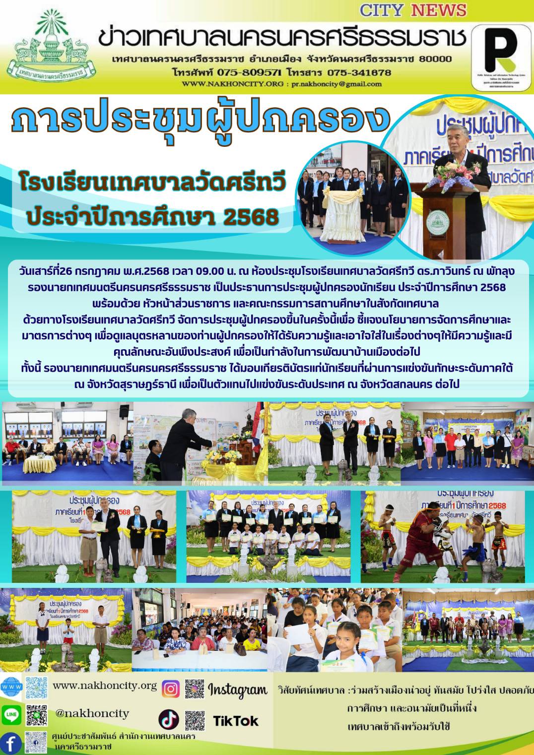 | ดร.ภาวินทร์ ณ พัทลุง รองนายกเทศมนตรีนครนครศรีธรรมราช เป็นประธานการประชุมผู้ปกครองนักเรียนโรงเรียนเทศบาลวัดศรีทวี ประจำปีการศึกษา 2568 |