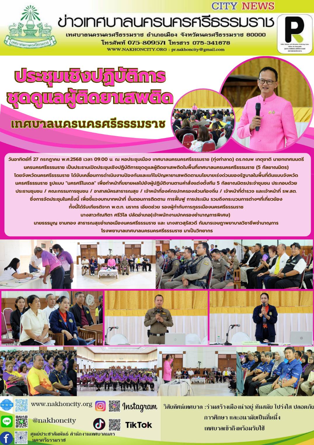 | วันอาทิตย์ที่ 27 กรกฎาคม พ.ศ.2568 เวลา 09.00 น. ณ หอประชุมเมือง เทศบาลนครนครศรีธรรมราช (ทุ่งท่าลาด) ดร.กณพ เกตุชาติ นายกเทศมนตรีนครนครศรีธรรมราช เป็นประธานเปิดประชุมเชิงปฏิบัติการชุดดูแลผู้ติดยาเสพติดในพื้นที่เทศบาลนครนครศรีธรรมราช (5 กัลยาณมิตร) โดยจังหวัดนครศรีธรรมราช ได้ขับเคลื่อนการดำเนินงานป้องกันและแก้ไขปัญหายาเสพติดตามนโยบายเร่งด่วนของรัฐบาลในพื้นที่ต้นแบบจังหวัดนครศรีธรรมราช รูปแบบ "นครศรีโมเดล" เพื่อทำหน้าที่ขยายผลไปยังผู้ปฏิบัติงานตามคำสั่งแต่งตั้งทีม 5 กัลยาณมิตรประจำชุมชน ประกอบด้วย ประธานชุมชน / คณะกรรมการชุมชน / อาสาสมัครสาธารณสุข / เจ้าหน้าที่องค์กรปกครองส่วนท้องถิ่น / เจ้าหน้าที่ตำรวจ และเจ้าหน้าที่ รพ.สต. ซึ่งการจัดประชุมในครั้งนี้ เพื่อชี้แจงบทบาทหน้าที่ ขั้นตอนการติดตาม การฟื้นฟู การประเมิน รวมถึงกระบวนการต่างๆที่เกี่ยวข้อง ทั้งนี้ได้รับเกียรติจาก พ.ต.ท. นรากร เอียดช่วย รองผู้กำกับการภูธรเมืองนครศรีธรรมราช นางสาวกัณฑิตา ศรีวิไล ปลัดอำเภอ(เจ้าพนักงานปกครองชำนาญการพิเศษ) นายธรรมูญ ชามทอง สาธารณสุขอำเภอเมืองนครศรีธรรมราช และ นางสาวสุรัสวดี กัมมารเจษฎา พยาบาลวิชาชีพชำนาญการ โรงพยาบาลเทศบาลนครนครศรีธรรมราช มาเป็นวิทยากร ................. ภาพ//ข่าว//จันทร์จิรา ตรวจทาน//ฐิตินันท์ |