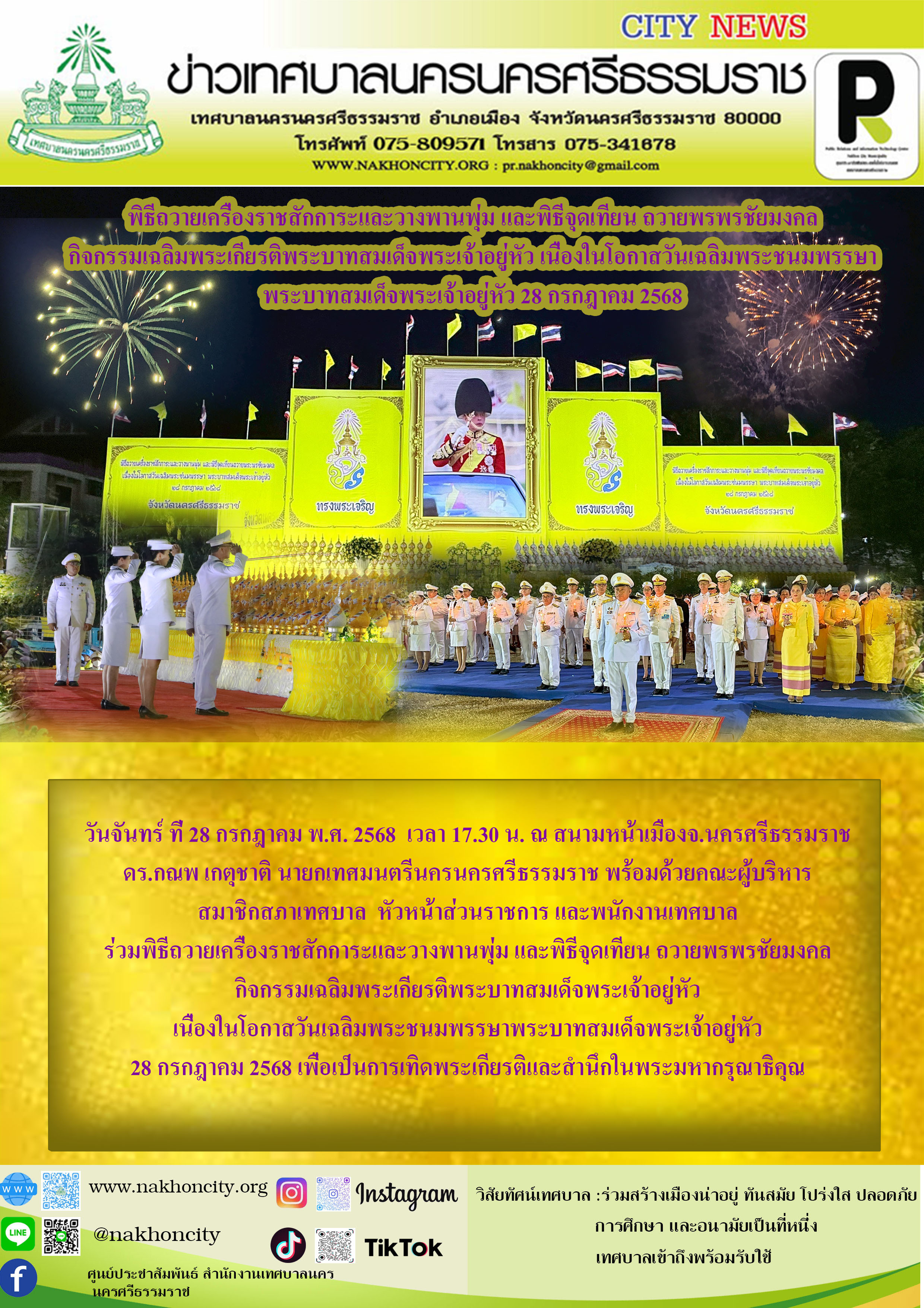 | นายกเทศมนตรีนครนครศรีธรรมราช พร้อมด้วยคณะผู้บริหาร สมาชิกสภาเทศบาล หัวหน้าส่วนราชการ และพนักงานเทศบาล ร่วมพิธีถวายเครื่องราชสักการะและวางพานพุ่ม และพิธีจุดเทียนถวายพระพรชัยมงคลกิจกรรมเฉลิมพระเกียรติพระบาทสมเด็จพระเจ้าอยู่หัว เนื่องในโอกาสวันเฉลิมพระชนมพรรษาพระบาทสมเด็จพระเจ้าอยู่หัว 28 กรกฎาคม 2568 |