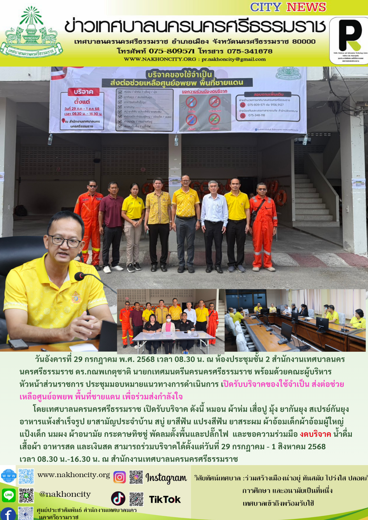 | วันอังคารที่ 29 กรกฎาคม พ.ศ. 2568 เวลา 08.30 น. ณ ห้องประชุมชั้น 2 สำนักงานเทศบาลนครนครศรีธรรมราช ดร.กณพ เกตุชาติ นายกเทศมนตรีนครนครศรีธรรมราช พร้อมด้วยคณะผู้บริหาร หัวหน้าส่วนราชการ ประชุมมอบหมายแนวทางการดำเนินการเปิดรับบริจาค ของใช้จำเป็น ส่งต่อช่วยเหลือศูนย์อพยพ พื้นที่ชายแดน เพื่อร่วมส่งกำลังใจ โดยเทศบาลนครนครศรีธรรมราช เปิดรับบริจาค ดังนี้ หมอน ผ้าห่ม เสื่อปู มุ้ง ยากันยุง สเปรย์กันยุง อาหารแห้งสำเร็จรูป ยาสามัญประจำบ้าน สบู่ ยาสีฟัน แปรงสีฟัน ยาสระผม ผ้าอ้อมเด็ก ผ้าอ้อมผู้ใหญ่ แป้งเด็ก นมผง ผ้าอนามัย กระดาษทิชชู่ พัดลมตั้งพื้น และปลั๊กไฟ และขอความร่วมมือ งดบริจาค น้ำดื่ม เสื้อผ้า อาหารสด และเงินสด สามารถร่วมบริจาคได้ตั้งแต่วันที่ 29 กรกฎาคม - 1 สิงหาคม 2568 เวลา 08.30 น.-16.30 น. ณ สำนักงานเทศบาลนครนครศรีธรรมราช |