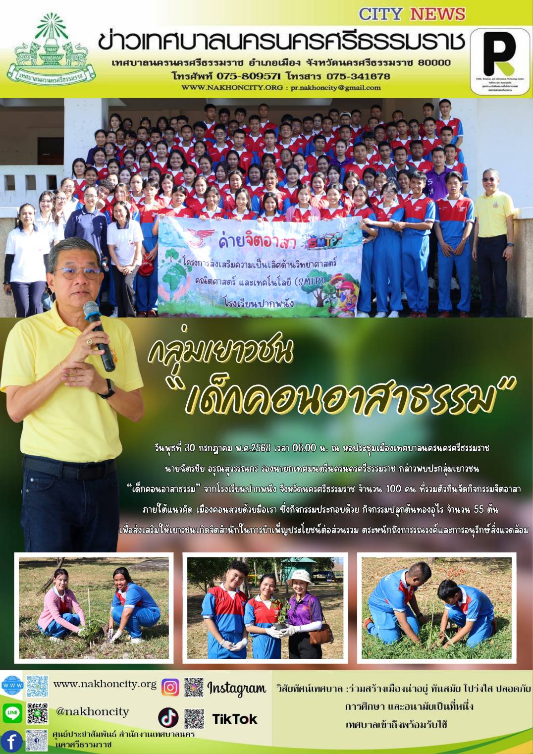 | วันพุธที่ 30 กรกฎาคม พ.ศ.2568 เวลา 08.00 น. ณ หอประชุมเมืองเทศบาลนครนครศรีธรรมราช นายฉัตรชัย อรุณสุวรรณกร รองนายกเทศมนตรีนครนครศรีธรรมราช กล่าวพบปะกลุ่มเยาวชน “เด็กคอนอาสาธรรม” จากโรงเรียนปากพนัง จังหวัดนครศรีธรรมราช จำนวน 100 คน ที่รวมตัวกันจัดกิจกรรมจิตอาสา ภายใต้แนวคิด เมืองคอนสวยด้วยมือเรา ซึ่งกิจกรรมประกอบด้วย กิจกรรมปลูกต้นทองอุไร จำนวน 55 ต้น  เพื่อส่งเสริมให้เยาวชนเกิดจิตสำนึกในการบำเพ็ญประโยชน์ต่อส่วนรวม ตระหนักถึงการรณรงค์และการอนุรักษ์สิ่งแวดล้อม  |