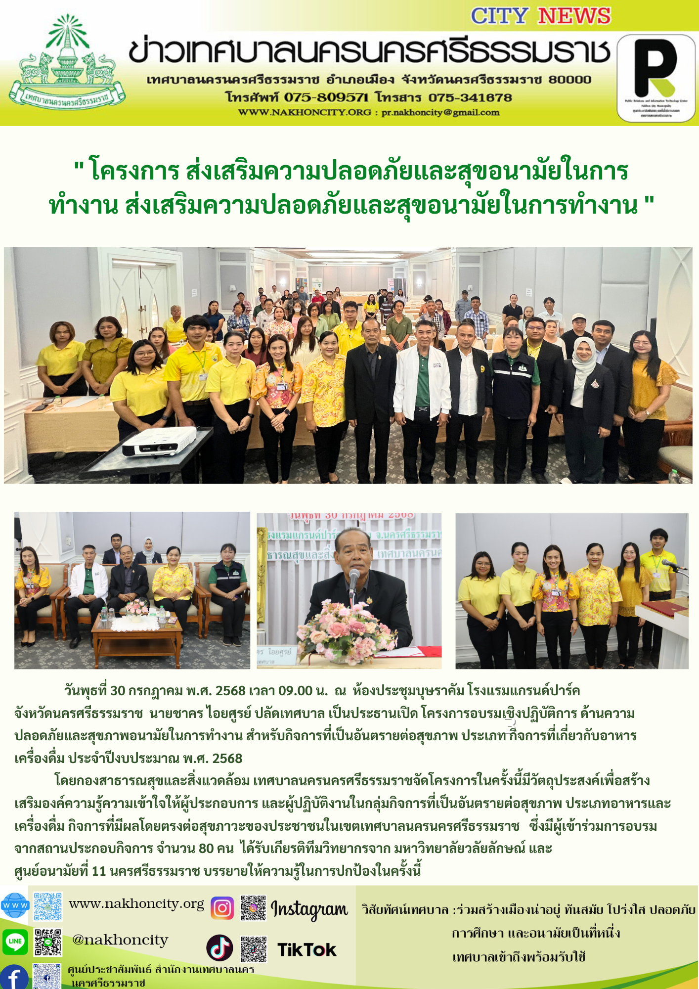 | วันพุธที่ 30 กรกฎาคมพ.ศ. 2568 ณห้องประชุมบุษราคัม โรงแรมแกรนด์ปาร์ค จังหวัดนครศรีธรรมราช นายชาคร ไอยศูรย์ ปลัดเทศบาล เป็นประธานเปิด โครงการอบรมเชิงปฏิบัติการ ด้านความปลอดภัยและสุขภาพอนามัยในการทำงาน สำหรับกิจการที่เป็นอันตรายต่อสุขภาพ ประเภท กิจการที่เกี่ยวกับอาหาร เครื่องดื่ม ประจำปีงบประมาณ พ.ศ. 2568 โดยกองสาธารณสุขและสิ่งแวดล้อม เทศบาลนครนครศรีธรรมราชจัดโครงการในครั้งนี้มีวัตถุประสงค์เพื่อสร้างเสริมองค์ความรู้ความเข้าใจให้ผู้ประกอบการ และผู้ปฏิบัติงานในกลุ่มกิจการที่เป็นอันตรายต่อสุขภาพ ประเภทอาหารและเครื่องดื่ม กิจการที่มีผลโดยตรงต่อสุขภาวะของประชาชนในเขตเทศบาลนครนครศรีธรรมราช ซึ่งมีผู้เข้าร่วมการอบรม จากสถานประกอบกิจการ จำนวน 80 คน ได้รับเกียรติทีมวิทยากรจาก มหาวิทยาลัยวลัยลักษณ์ และ ศูนย์อนามัยที่ 11 นครศรีธรรมราช บรรยายให้ความรู้ในการปกป้องในครั้งนี้ |