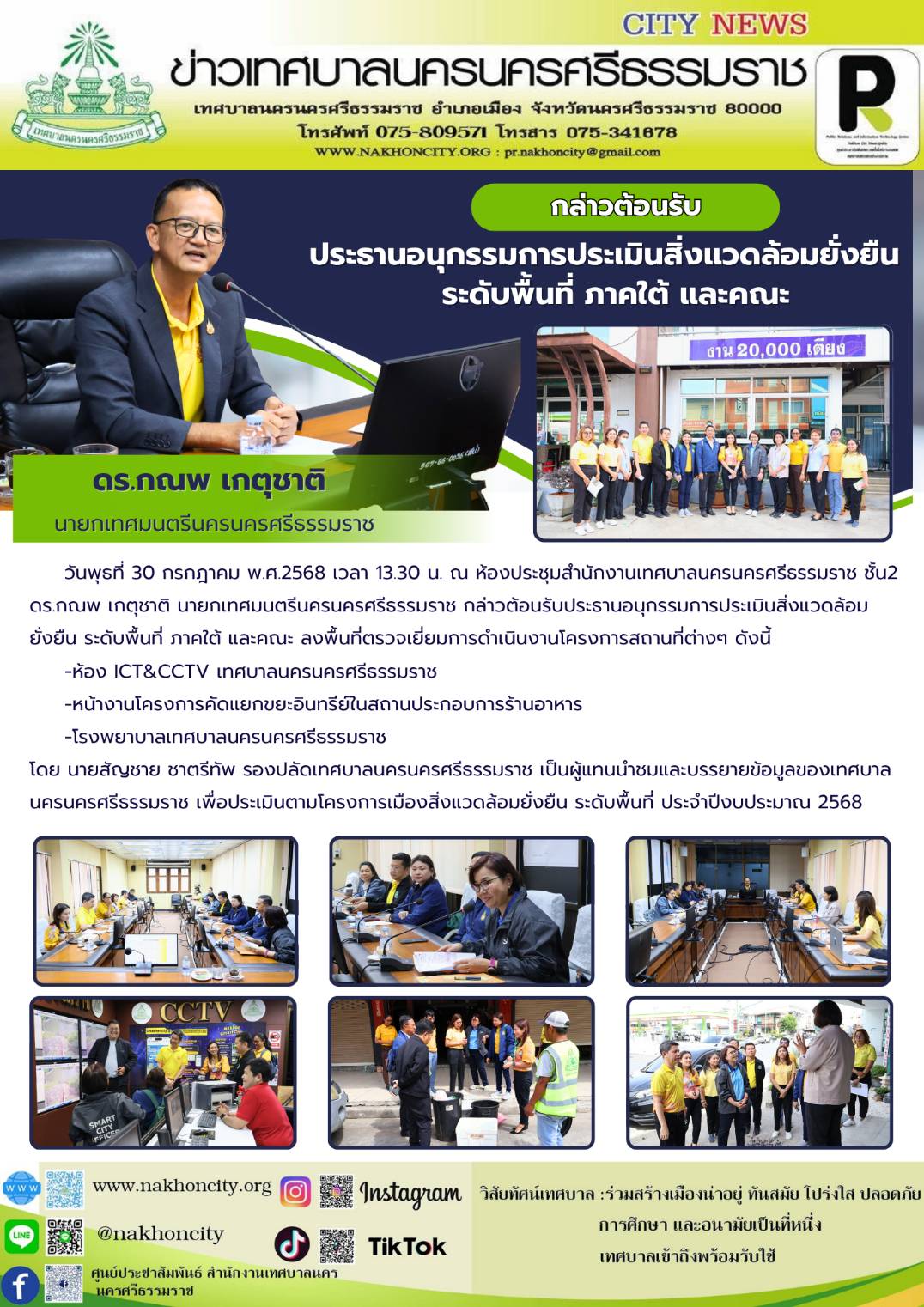 | วันพุธที่ 30 กรกฎาคม พ.ศ.2568 เวลา 13.30 น. ณ ห้องประชุมสำนักงานเทศบาลนครนครศรีธรรมราช ชั้น2 ดร.กณพ เกตุชาติ นายกเทศมนตรีนครนครศรีธรรมราช กล่าวต้อนรับประธานอนุกรรมการประเมินสิ่งแวดล้อมยั่งยืน ระดับพื้นที่ ภาคใต้ และคณะ ลงพื้นที่ตรวจเยี่ยมการดำเนินงานโครงการสถานที่ต่างๆ ดังนี้