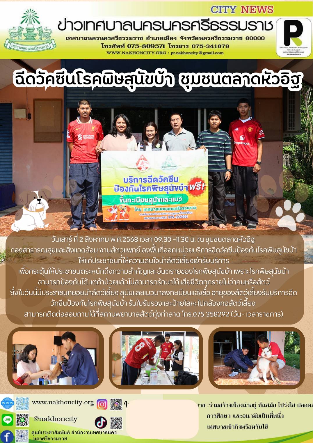 | วันเสาร์ ที่ 2 สิงหาคม พ.ศ.2568 เวลา 09.30 -11.30 น. ณ ชุมชนตลาดหัวอิฐ กองสาธารณสุขและสิ่งแวดล้อม งานสัตวแพทย์ ลงพื้นที่ออกหน่วยบริการฉีดวัคซีนป้องกันโรคพิษสุนัขบ้า ให้แก่ประชาชนที่ให้ความสนใจนำสัตว์เลี้ยงเข้ารับบริการ |