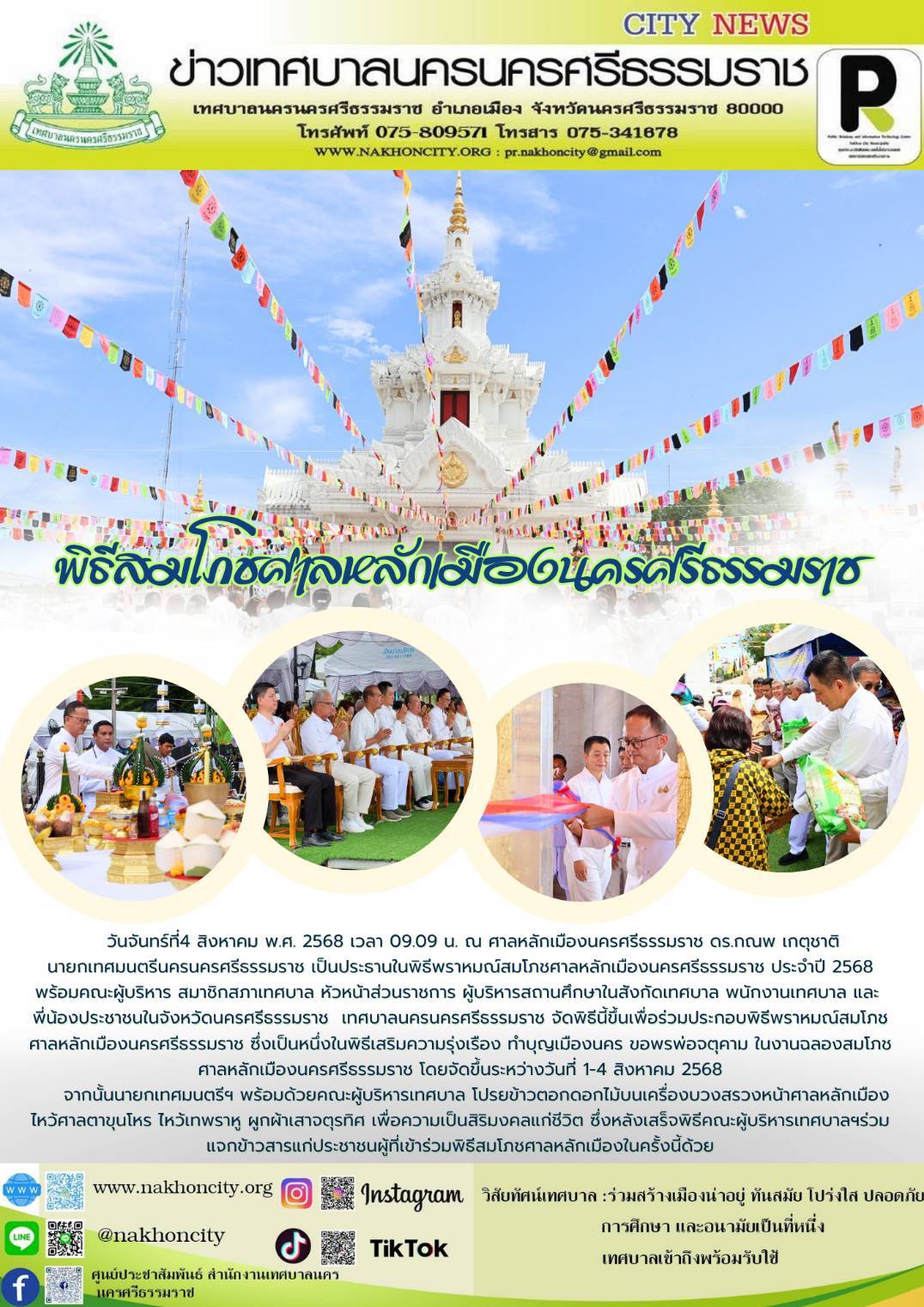 | วันจันทร์ที่4 สิงหาคม พ.ศ. 2568 เวลา 09.09 น. ณ ศาลหลักเมืองนครศรีธรรมราช ดร.กณพ เกตุชาติ นายกเทศมนตรีนครนครศรีธรรมราช เป็นประธานในพิธีพราหมณ์สมโภชศาลหลักเมืองนครศรีธรรมราช ประจำปี 2568 พร้อมคณะผู้บริหาร สมาชิกสภาเทศบาล หัวหน้าส่วนราชการ ผู้บริหารสถานศึกษาในสังกัดเทศบาล พนักงานเทศบาล และพี่น้องประชาชนในจังหวัดนครศรีธรรมราช      เทศบาลนครนครศรีธรรมราช จัดพิธีนี้ขึ้นเพื่อร่วมประกอบพิธีพราหมณ์สมโภชศาลหลักเมืองนครศรีธรรมราช ซึ่งเป็นหนึ่งในพิธีเสริมความรุ่งเรือง ทำบุญเมืองนคร ขอพรพ่อจตุคาม ในงานฉลองสมโภชศาลหลักเมืองนครศรีธรรมราช โดยจัดขึ้นระหว่างวันที่ 1-4 สิงหาคม 2568 |
