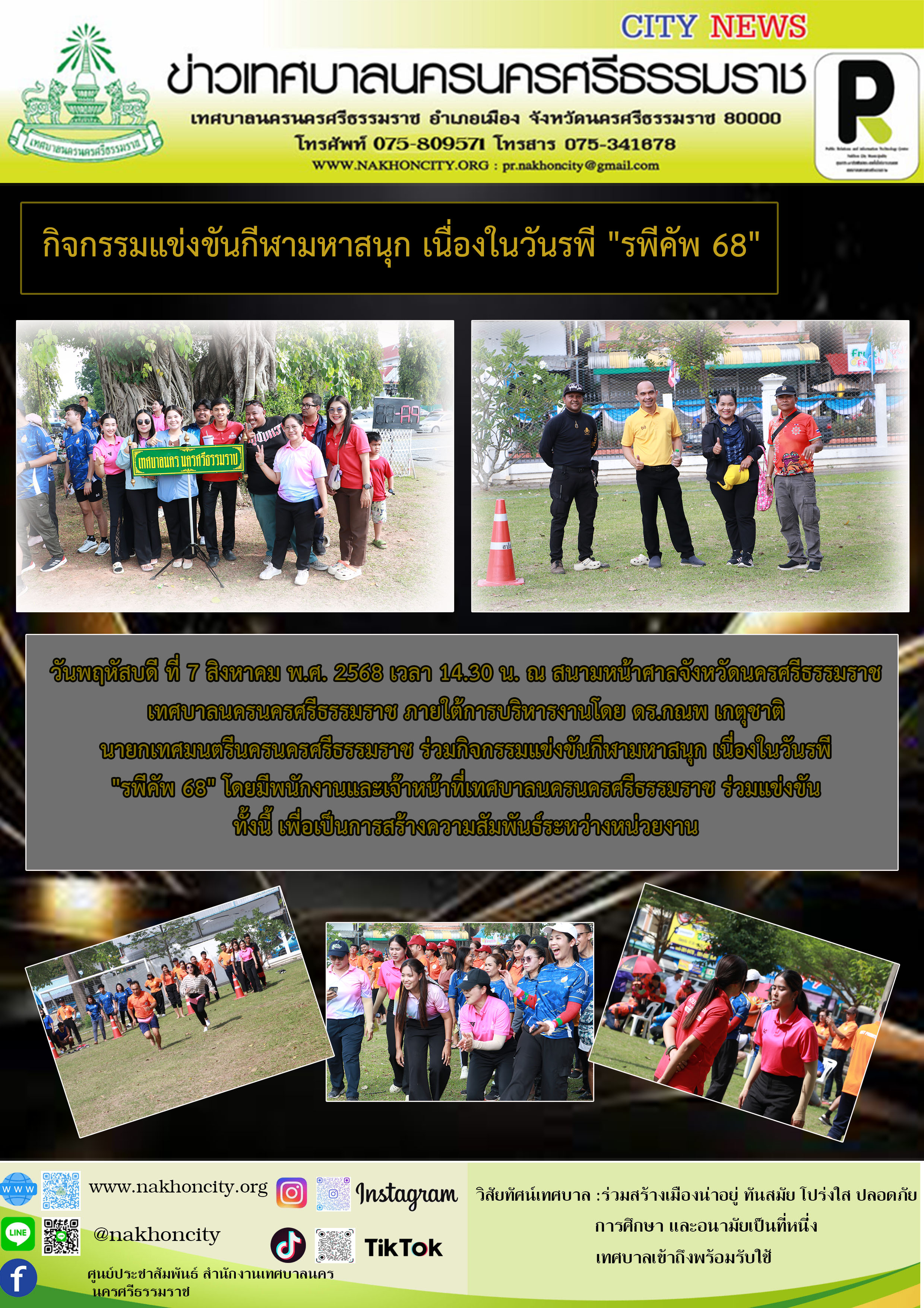 | เทศบาลนครนครศรีธรรมราช ภายใต้การบริหารงานโดยดร.กณพ เกตุชาติ นายกเทศมนตรีนครนครศรีธรรมราช ร่วมกิจกรรมแข่งขันกีฬามหาสนุก เนื่องในวันรพี "รพีคัพ 68" |