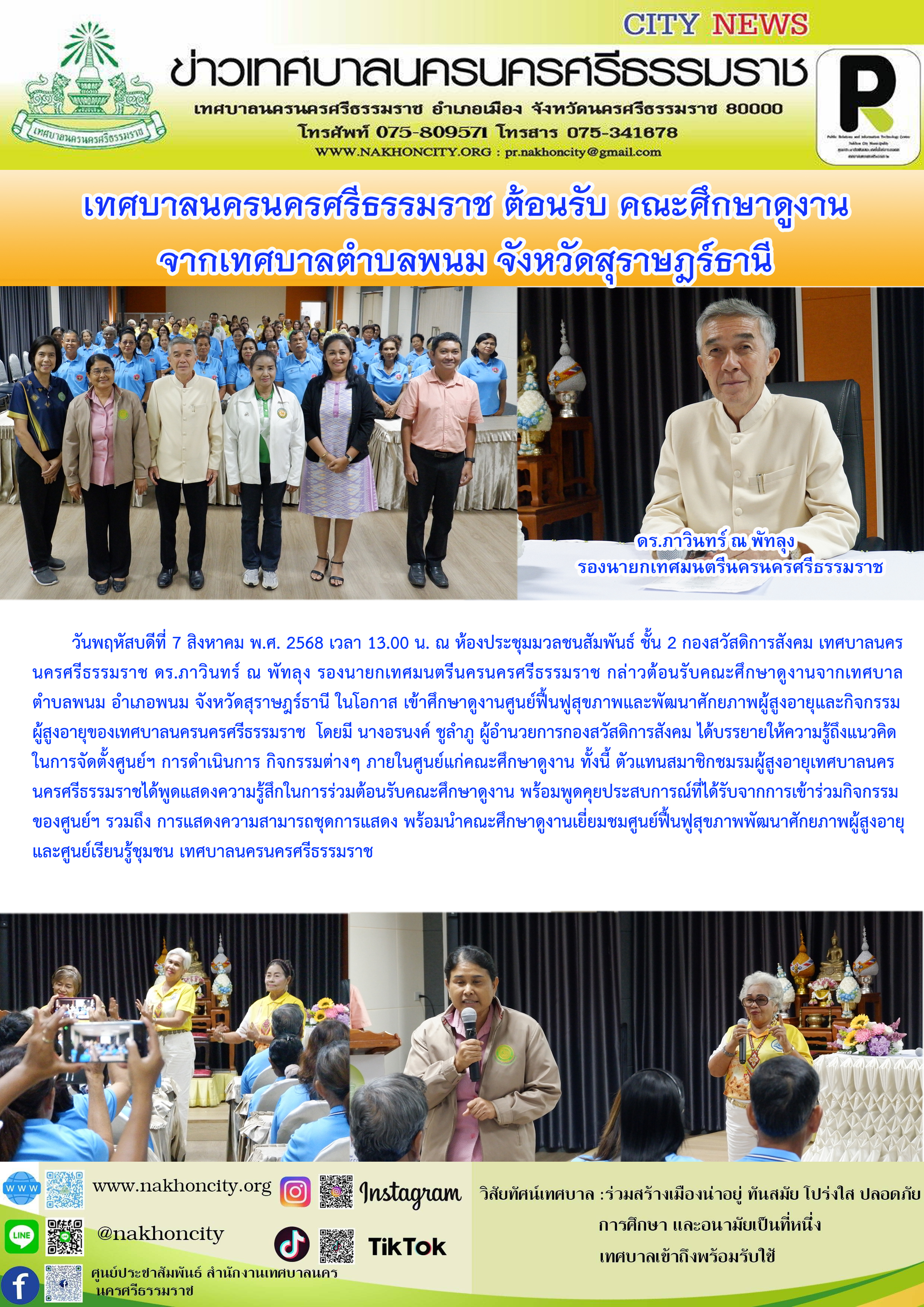 | วันพฤหัสบดีที่ 7 สิงหาคม พ.ศ. 2568 เวลา 13.00 น. ณ ห้องประชุมมวลชนสัมพันธ์ ชั้น 2 กองสวัสดิการสังคม เทศบาลนครนครศรีธรรมราช ดร.ภาวินทร์ ณ พัทลุง รองนายกเทศมนตรีนครนครศรีธรรมราช กล่าวต้อนรับคณะศึกษาดูงานจากเทศบาลตำบลพนม อำเภอพนม จังหวัดสุราษฎร์ธานี ในโอกาส เข้าศึกษาดูงานศูนย์ฟื้นฟูสุขภาพและพัฒนาศักยภาพผู้สูงอายุ และกิจกรรมผู้สูงอายุของเทศบาลนครนครศรีธรรมราช โดยมี นางอรนงค์ ชูลำภู ผู้อำนวยการกองสวัสดิการสังคม ได้บรรยายให้ความรู้ถึงแนวคิดในการจัดตั้งศูนย์ฯ การดำเนินการ กิจกรรมต่างๆ ภายในศูนย์แก่คณะศึกษาดูงาน ทั้งนี้ ตัวแทนสมาชิกชมรมผู้สูงอายุเทศบาลนครนครศรีธรรมราชได้พูดแสดงความรู้สึกในการร่วมต้อนรับคณะศึกษาดูงานพร้อมพูดคุยประสบการณ์ที่ได้รับจากการเข้าร่วมกิจกรรมของศูนย์ฯ รวมถึง การแสดงความสามารถชุดการแสดง พร้อมนำคณะศึกษาดูงานได้เยี่ยมชมศูนย์ฟื้นฟูสุขภาพพัฒนาศักยภาพผู้สูงอายุและศูนย์เรียนรู้ชุมชน เทศบาลนครนครศรีธรรมราช |