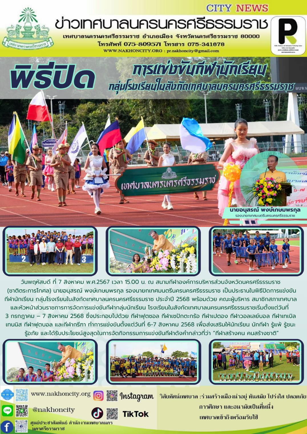 | วันพฤหัสบดี ที่ 7 สิงหาคม พ.ศ.2567 เวลา 15.00 น. ณ สนามกีฬาองค์การบริหารส่วนจังหวัดนครศรีธรรมราช (ชาติตระการโกศล) นายอนุสรณ์ พงษ์เกษมพรกุล รองนายกเทศมนตรีนครนครศรีธรรมราช เป็นประธานในพิธีปิดการแข่งขันกีฬานักเรียน กลุ่มโรงเรียนในสังกัดเทศบาลนครนครศรีธรรมราช ประจำปี 2568 พร้อมด้วย คณะผู้บริหาร สมาชิกสภาเทศบาล และหัวหน้าส่วนราชการการจัดการแข่งขันกีฬากลุ่มนักเรียน โรงเรียนในสังกัดเทศบาลนครนครศรีธรรมราชเริ่มตั้งแต่วันที่ 3 กรกฎาคม – 7 สิงหาคม 2568 ซึ่งประกอบไปด้วย กีฬาฟุตซอล กีฬาเซปักตะกร้อ กีฬาเปตอง กีฬาวอลเลย์บอล กีฬาเทเบิลเทนนิส กีฬาฟุตบอล และกีฬากรีฑา ทำการแข่งขันตั้งแต่วันที่ 6-7 สิงหาคม 2568 เพื่อส่งเสริมให้นักเรียน นักกีฬา รู้แพ้ รู้ชนะ รู้อภัย และได้รับประโยชน์สูงสุดในการจัดกิจกรรมการแข่งขันกีฬาดังคำกล่าวที่ว่า “กีฬาสร้างคน คนสร้างชาติ” ............. ภาพ//ข่าว//จันทร์จิรา ตรวจทาน//ฐิตินันท์ |