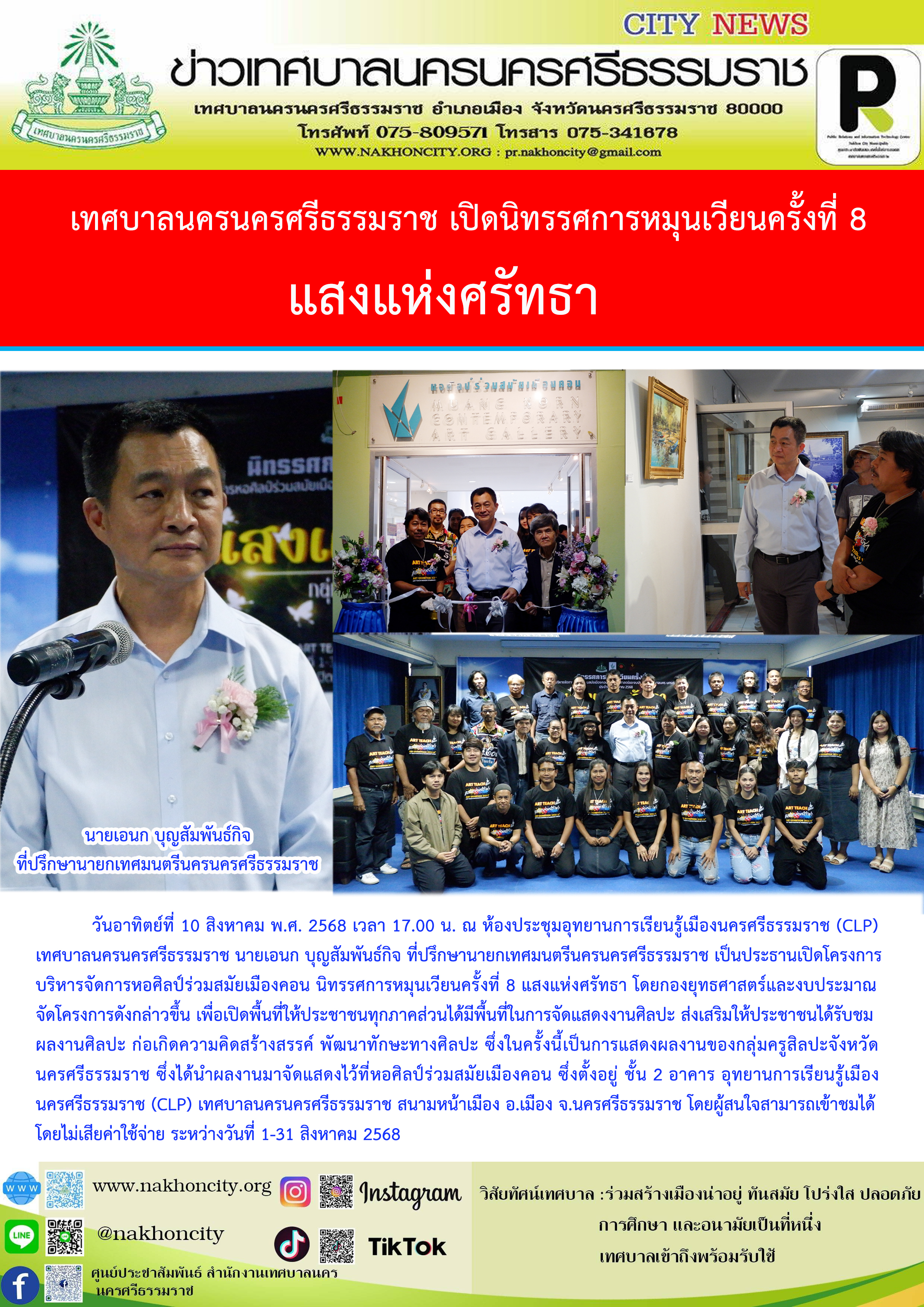 | วันอาทิตย์ที่ 10 สิงหาคม พ.ศ. 2568 เวลา 17.00 น. ณ ห้องประชุมอุทยานการเรียนรู้เมืองนครศรีธรรมราช ( CLP) เทศบาลนครนครศรีธรรมราช นายเอนก บุญสัมพันธ์กิจ ที่ปรึกษานายกเทศมนตรีนครนครศรีธรรมราช เป็นประธานเปิดโครงการบริหารจัดการหอศิลป์ร่วมสมัยเมืองคอน นิทรรศการหมุนเวียนครั้งที่ 8 แสงแห่งศรัทธา โดยกองยุทธศาสตร์และงบประมาณ จัดโครงการดังกล่าวขึ้น เพื่อเปิดพื้นที่ให้ประชาชนทุกภาคส่วนได้มีพื้นที่ในการจัดแสดงงานศิลปะ ส่งเสริมให้ประชาชนได้รับชมผลงานศิลปะ ก่อเกิดความคิดสร้างสรรค์ พัฒนาทักษะทางศิลปะ ซึ่งในครั้งนี้เป็นการแสดงผลงานของกลุ่มครูสิลปะจังหวัดนครศรีธรรมราช ซึ่งได้นำผลงานมาจัดแสดงไว้ที่หอศิลป์ร่วมสมัยเมืองคอน ซึ่งตั้งอยู่ ชั้น 2 อาคาร อุทยานการเรียนรู้เมืองนครศรีธรรมราช ( CLP) เทศบาลนครนครศรีธรรมราช สนามหน้าเมือง อ.เมือง จ.นครศรีธรรมราช โดยผู้สนใจสามารถเข้าชมได้โดยไม่เสียค่าใช้จ่าย ระหว่างวันที่ 1-31 สิงหาคม 2568 |