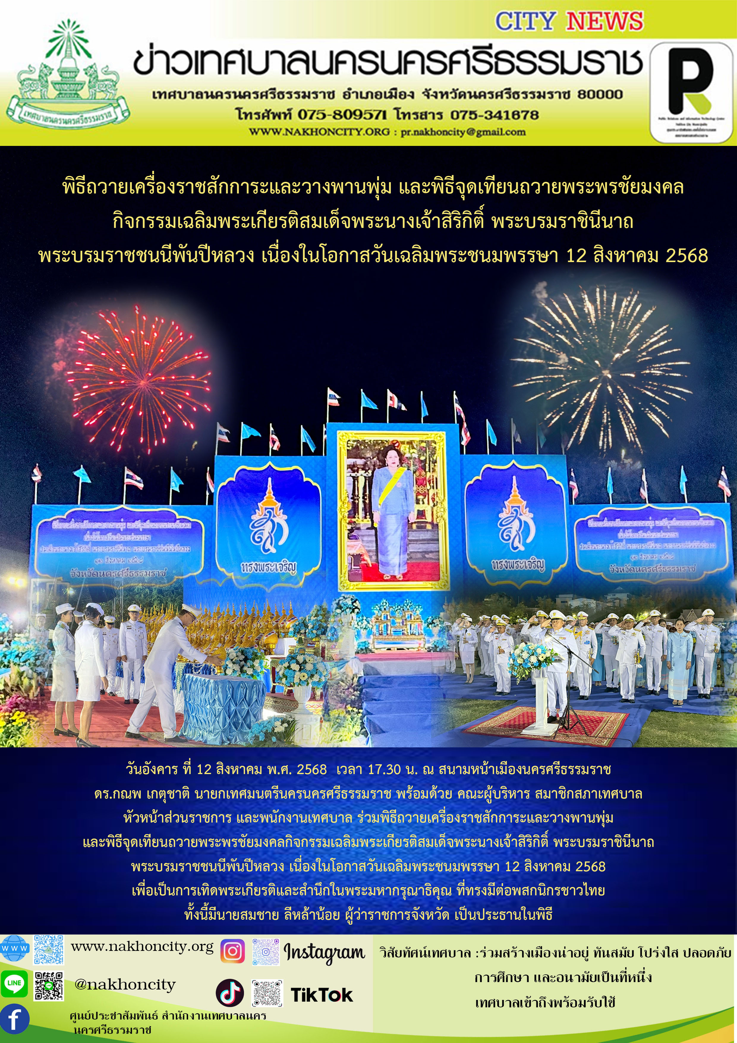 | นายกเทศมนตรีนครนครศรีธรรมราช ร่วมพิธีถวายเครื่องราชสักการะและวางพานพุ่ม และพิธีจุดเทียนถวายพระพรชัยมงคลกิจกรรมเฉลิมพระเกียรติสมเด็จพระนางเจ้าสิริกิติ์ พระบรมราชินีนาถ พระบรมราชชนนีพันปีหลวง เนื่องในโอกาสวันเฉลิมพระชนมพรรษา 12 สิงหาคม 2568 |