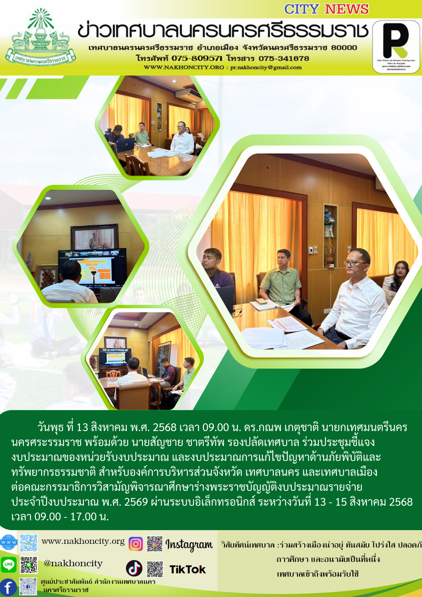 | วันพุธที่ 13 สิงหาคม พ.ศ. 2568 เวลา 09.00 น. ดร.กณพ เกตุชาติ นายกเทศมนตรีนครนครศระรรมราช พร้อมด้วย นายสัญชาย ชาตรีทัพ รองปลัดเทศบาล ร่วมประชุมชี้แจงงบประมาณของหน่วยรับงบประมาณ และงบประมาณการแก้ไขปัญหาด้านภัยพิบัติและทรัพยากรธรรมชาติ สำหรับองค์การบริหารส่วนจังหวัด เทศบาลนคร และเทศบาลเมือง ต่อคณะกรรมาธิการวิสามัญพิจารณาศึกษาร่างพระราชบัญญัติงบประมาณรายจ่ายประจำปีงบประมาณ พ.ศ. 2569 ผ่านระบบอิเล็กทรอนิกส์ ระหว่างวันที่ 13 - 15 สิงหาคม 2568 เวลา 09.00 - 17.00 น. |