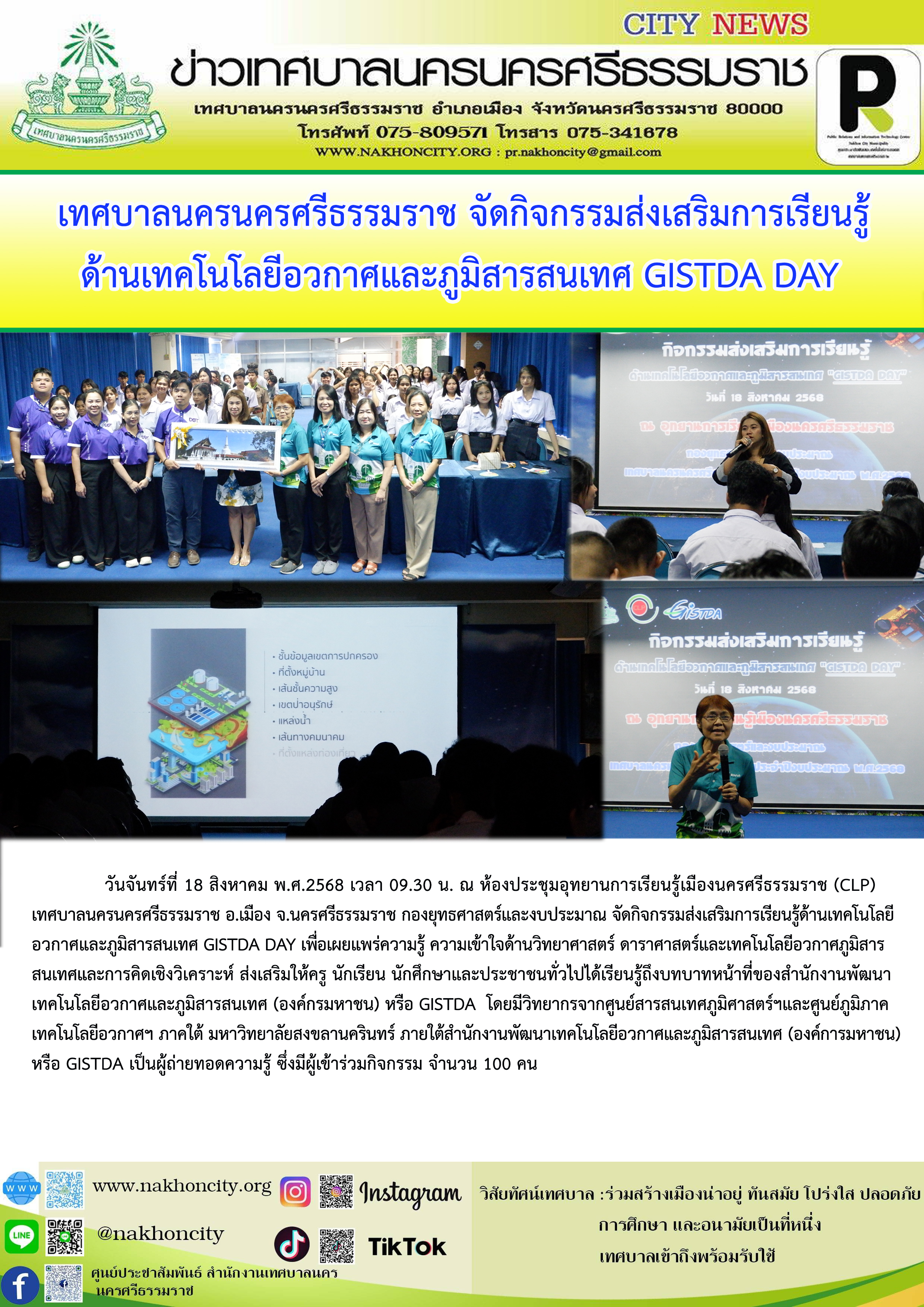 | เทศบาลนครนครศรีธรรมราช จัดกิจกรรมส่งเสริมการเรียนรู้ด้านเทคโนโลยีอวกาศและภูมิสารสนเทศ GISTDA DAY |