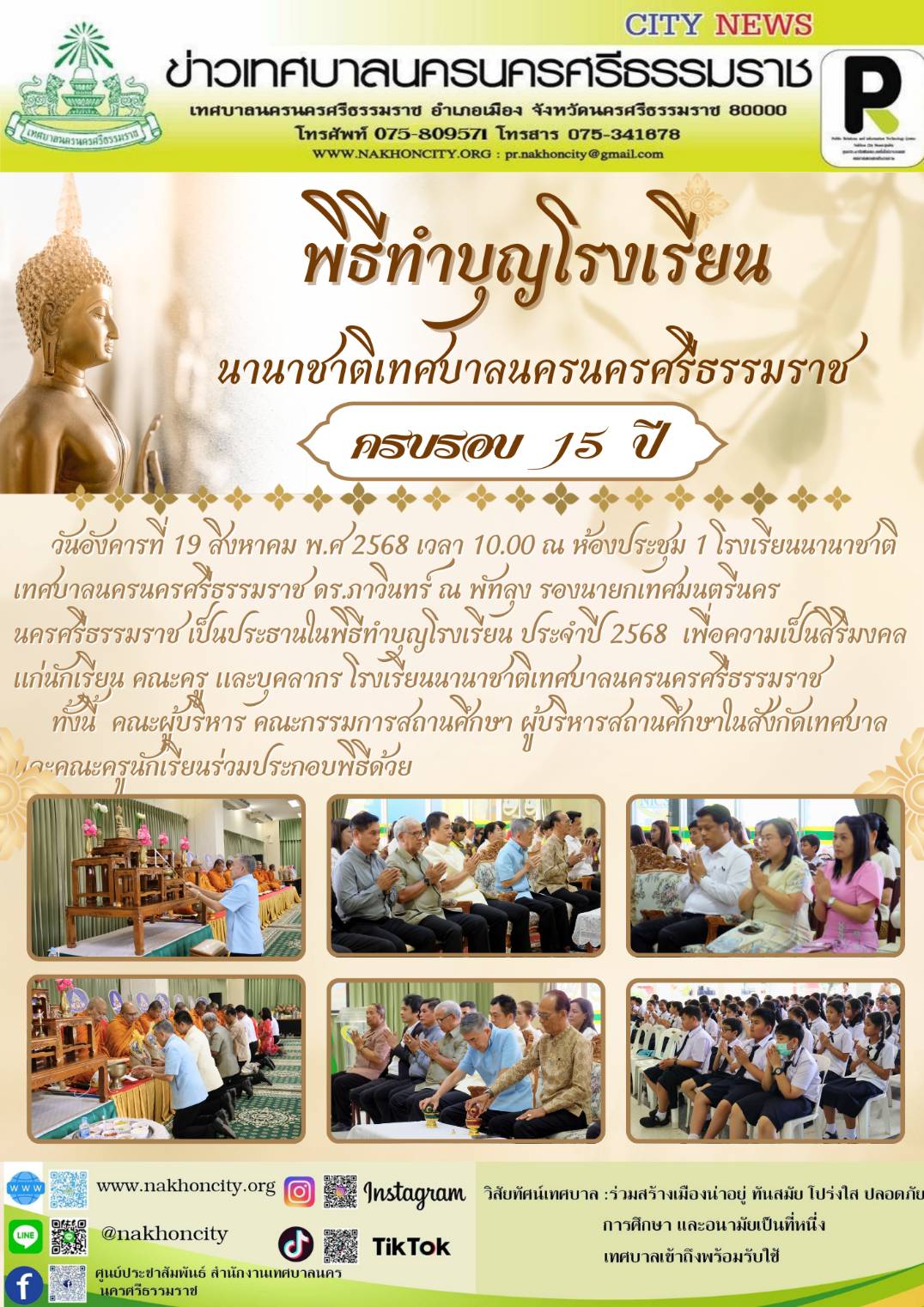 | วันอังคารที่ 19 สิงหาคม พ.ศ 2568 เวลา 10.00 ณ ห้องประชุม 1 โรงเรียนนานาชาติเทศบาลนครนครศรีธรรมราช ดร.ภาวินทร์ ณ พัทลุง รองนายกเทศมนตรีนครนครศรีธรรมราช เป็นประธานในพิธีทำบุญโรงเรียน ประจำปี 2568  เพื่อความเป็นสิริมงคลแก่นักเรียน คณะครู และบุคลากร โรงเรียนนานาชาติเทศบาลนครนครศรีธรรมราช |