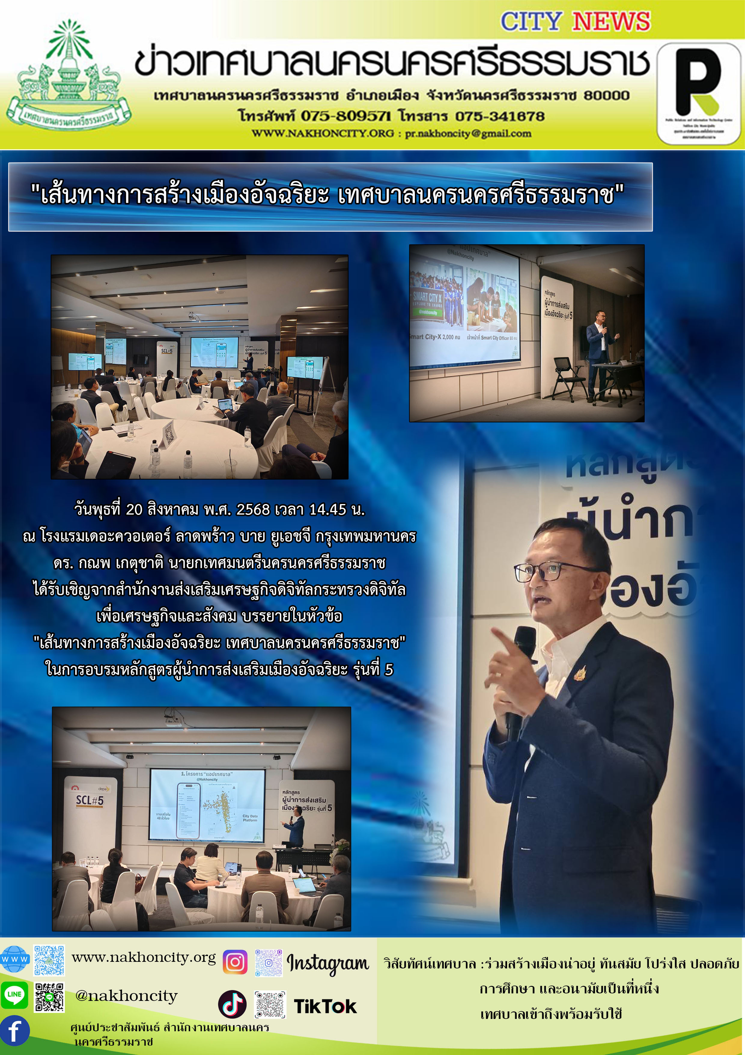 | วันพุธที่ 20 สิงหาคม พ.ศ. 2568 เวลา 14.45 น. ณ โรงแรมเดอะควอเตอร์ ลาดพร้าว บาย ยูเอชจี กรุงเทพมหานคร ดร. กณพ เกตุชาติ นายกเทศมนตรีนครนครศรีธรรมราช ได้รับเชิญจากสำนักงานส่งเสริมเศรษฐกิจดิจิทัลกระทรวงดิจิทัล เพื่อเศรษฐกิจและสังคม บรรยายในหัวข้อ "เส้นทางการสร้างเมืองอัจฉริยะ เทศบาลนครนครศรีธรรมราช" ในการอบรมหลักสูตรผู้นำการส่งเสริมเมืองอัจฉริยะ รุ่นที่ 5 |