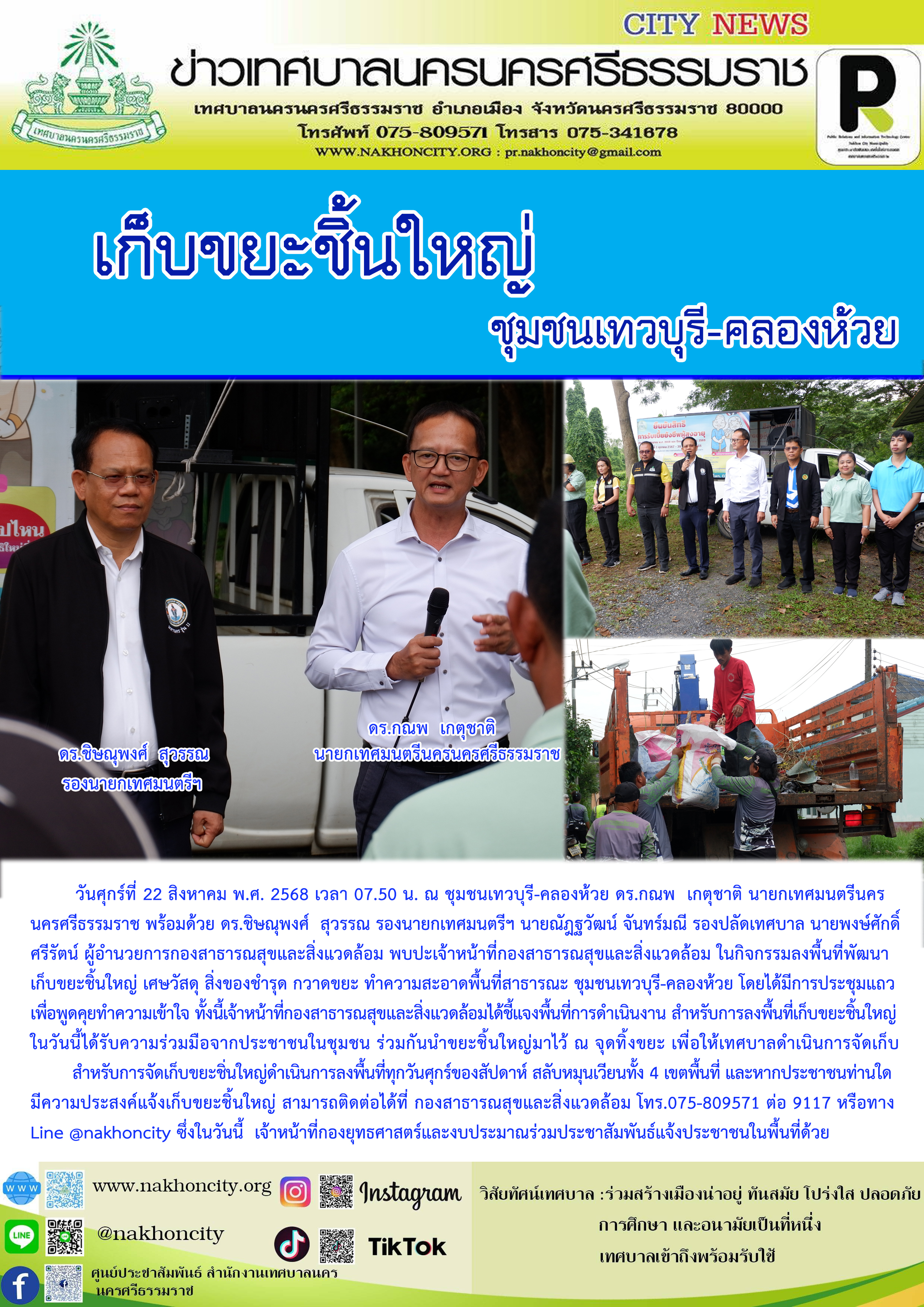 | วันศุกร์ที่ 22 สิงหาคม พ.ศ. 2568 เวลา 07.50 น. ณ ชุมชนเทวบุรี-คลองห้วย ดร.กณพ เกตุชาติ นายกเทศมนตรีนครนครศรีธรรมราช พร้อมด้วย ดร.ชิษณุพงศ์ สุวรรณ รองนายกเทศมนตรีฯ นายณัฎฐวัฒน์ จันทร์มณี รองปลัดเทศบาล นายพงษ์ศักดิ์ ศรีรัตน์ ผู้อำนวยการกองสาธารณสุขและสิ่งแวดล้อม พบปะเจ้าหน้าที่กองสาธารณสุขและสิ่งแวดล้อม ในกิจกรรมลงพื้นที่พัฒนา เก็บขยะชิ้นใหญ่ เศษวัสดุ สิ่งของชำรุด กวาดขยะ ทำความสะอาดพื้นที่สาธารณะ ชุมชนเทวบุรี-คลองห้วย โดยได้มีการประชุมแถวเพื่อพูดคุยทำความเข้าใจ ทั้งนี้เจ้าหน้าที่กองสาธารณสุขและสิ่งแวดล้อมได้ชี้แจงพื้นที่การดำเนินงาน สำหรับการลงพื้นที่เก็บขยะชิ้นใหญ่ในวันนี้ได้รับความร่วมมือจากประชาชนในชุมชน ร่วมกันนำขยะชิ้นใหญ่มาไว้ ณ จุดทิ้งขยะ เพื่อให้เทศบาลดำเนินการจัดเก็บ สำหรับการจัดเก็บขยะชิ่นใหญ่ดำเนินการลงพื้นที่ทุกวันศุกร์ของสัปดาห์ สลับหมุนเวียนทั้ง 4 เขตพื้นที่ และหากประชาชนท่านใด มีความประสงค์แจ้งเก็บขยะชิ้นใหญ่ สามารถติดต่อได้ที่ กองสาธารณสุขและสิ่งแวดล้อม โทร.075-809571 ต่อ 9117 หรือทาง Line @nakhoncity ซึ่งในวันนี้ เจ้าหน้าที่กองยุทธศาสตร์และงบประมาณร่วมประชาสัมพันธ์แจ้งประชาชนในพื้นที่ด้วย |