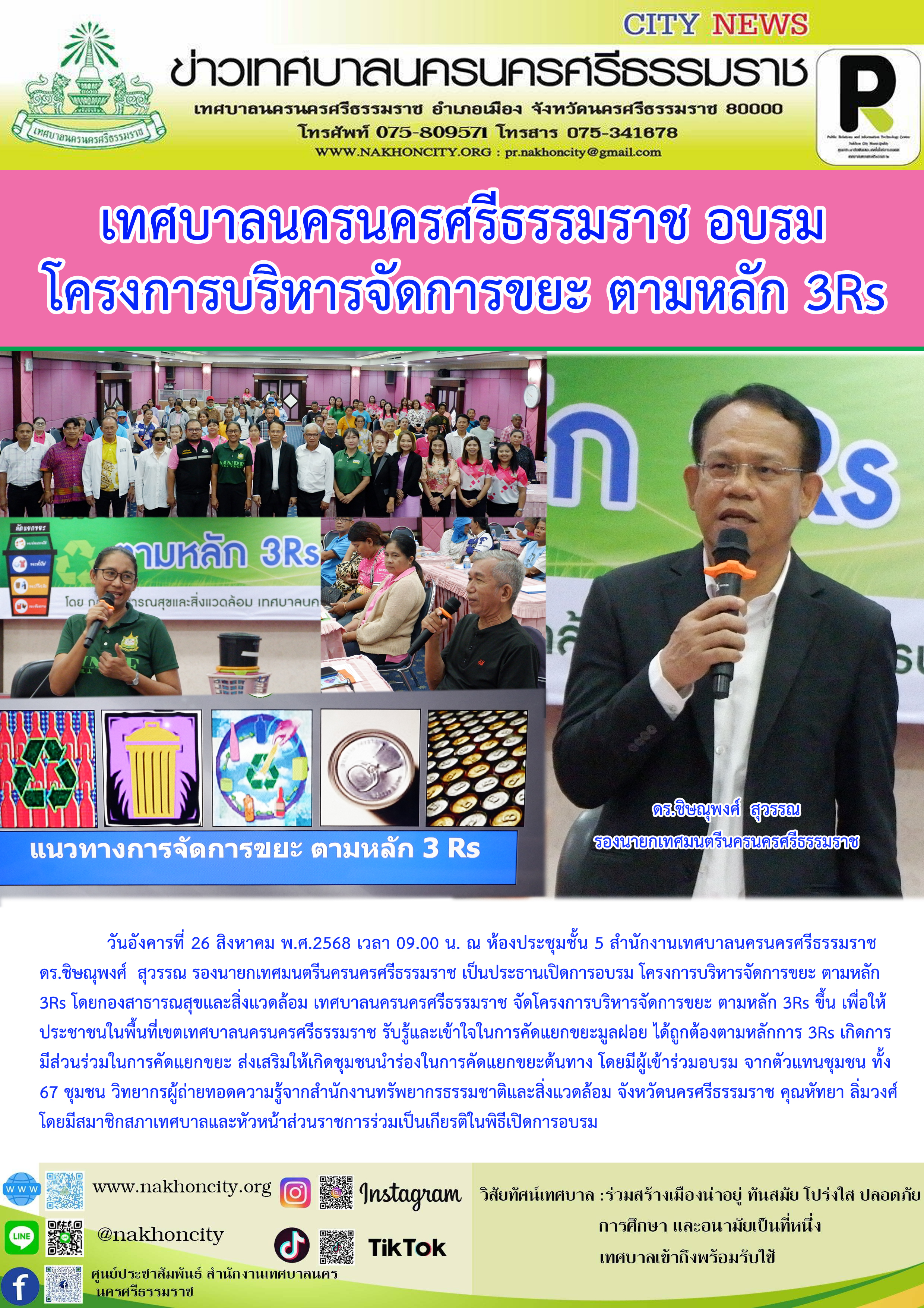 | วันอังคารที่ 26 สิงหาคม พ.ศ.2568 เวลา 09.00 น. ณ ห้องประชุมชั้น 5 สำนักงานเทศบาลนครนครศรีธรรมราช ดร.ชิษณุพงศ์ สุวรรณ รองนายกเทศมนตรีนครนครศรีธรรมราช เป็นประธานเปิด โครงการบริหารจัดการขยะ ตามหลัก 3Rs โดยกองสาธารณสุขและสิ่งแวดล้อม เทศบาลนครนครศรีธรรมราช จัดโครงการบริหารจัดการขยะ ตามหลัก 3Rsขึ้นเพื่อให้ประชาชนในพื้นที่เขตเทศบาลนครนครศรีธรรมราช รับรู้และเข้าใจในการคัดแยกขยะมูลฝอย ได้ถูกต้องตามหลักการ 3Rs เกิดกระบวนการมีส่วนร่วมในการคัดแยกขยะ ส่งเสริมให้เกิดชุมชนนำร่องในการคัดแยกขยะต้นทาง โดยมีผู้เข้าร่วมอบรม จากตัวแทนชุมชน ทั้ง 67 ชุมชน วิทยากรผู้ถ่ายทอดความรู้ จากสำนักงานทรัพยากรธรรมชาติและสิ่งแวดล้อม จังหวัดนครศรีธรรมราช คุณหัทยา ลิ่มวงศ์ โดยมีสมาชิกสภาเทศบาลและหัวหน้าส่วนราชการร่วมเป็นเกียรติในพิธีเปิดการอบรม |