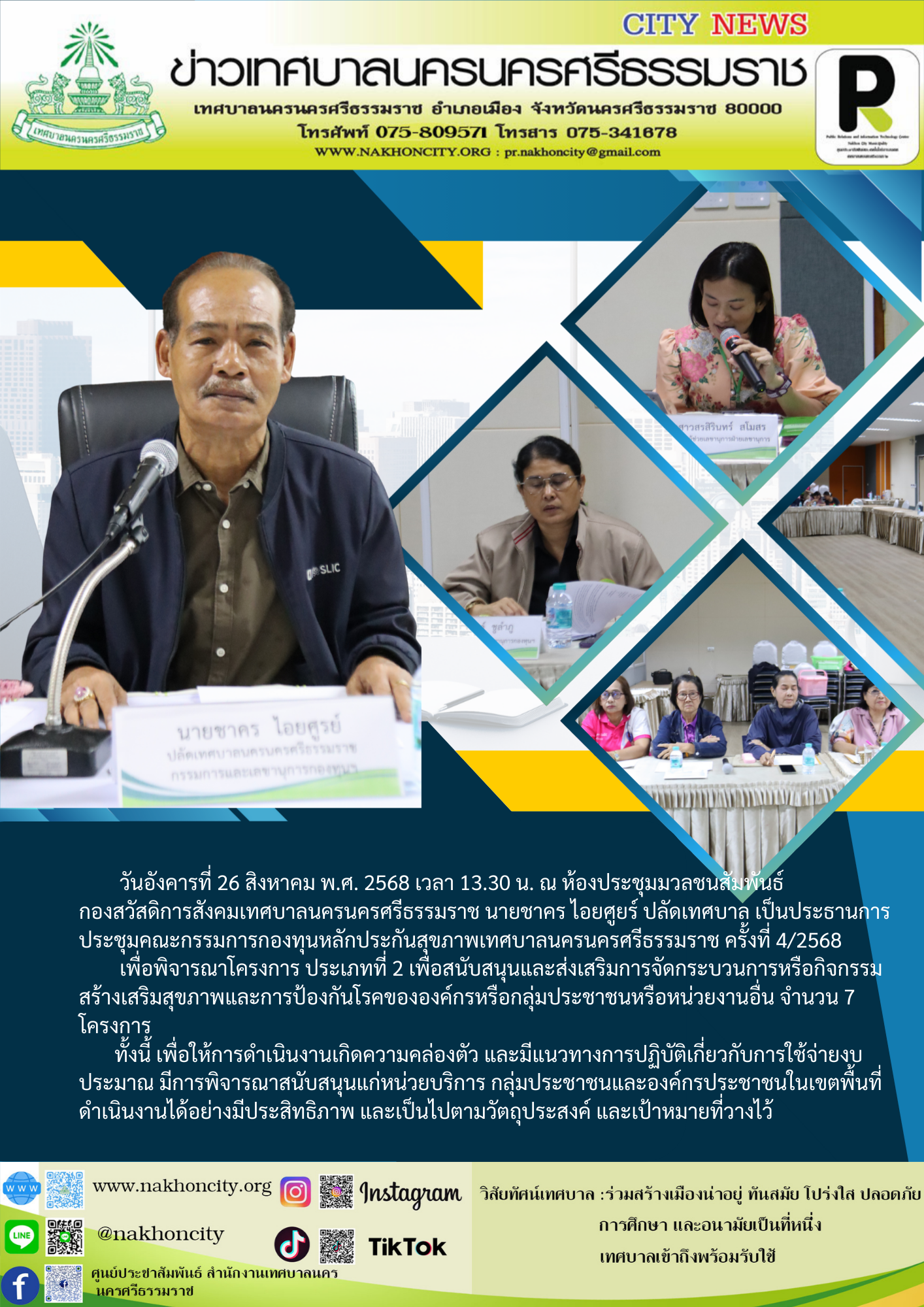 | วันอังคารที่ 26 สิงหาคม พ.ศ. 2568 เวลา 13.30 น. ณ ห้องประชุมมวลชนสัมพันธ์ กองสวัสดิการสังคมเทศบาลนครนครศรีธรรมราช นายชาคร ไอยศูยร์ ปลัดเทศบาล เป็นประธานการประชุมคณะกรรมการกองทุนหลักประกันสุขภาพเทศบาลนครนครศรีธรรมราช ครั้งที่ 4/2568 เพื่อพิจารณาโครงการ ประเภทที่ 2 เพื่อสนับสนุนและส่งเสริมการจัดกระบวนการหรือกิจกรรมสร้างเสริมสุขภาพและการป้องกันโรคขององค์กรหรือกลุ่มประชาชนหรือหน่วยงานอื่น จำนวน 7 โครงการ ทั้งนี้ เพื่อให้การดำเนินงานเกิดความคล่องตัว และมีแนวทางการปฏิบัติเกี่ยวกับการใช้จ่ายงบประมาณ มีการพิจารณาสนับสนุนแก่หน่วยบริการ กลุ่มประชาชนและองค์กรประชาชนในเขตพื้นที่ดำเนินงานได้อย่างมีประสิทธิภาพ และเป็นไปตามวัตถุประสงค์ และเป้าหมายที่วางไว้ |