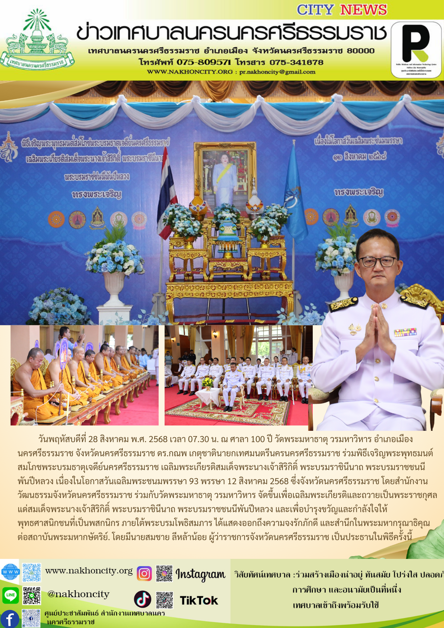 | วันพฤหัสบดีที่ 28 สิงหาคม พ.ศ. 2568 เวลา 07.30 น. ณ ศาลา 100 ปี วัดพระมหาธาตุ วรมหาวิหาร อำเภอเมืองนครศรีธรรมราช จังหวัดนครศรีธรรมราช ดร.กณพ เกตุชาติ นายกเทศมนตรีนครนครศรีธรรมราช ร่วมพิธีเจริญพระพุทธมนต์สมโภชพระบรมธาตุเจดีย์นครศรีธรรมราช เฉลิมพระเกียรติสมเด็จพระนางเจ้าสิริกิติ์ พระบรมราชินีนาถ พระบรมราชชนนีพันปีหลวง เนื่องในโอกาสวันเฉลิมพระชนมพรรษา 93 พรรษา 12 สิงหาคม 2568 ซึ่งจังหวัดนครศรีธรรมราช โดยสำนักงานวัฒนธรรมจังหวัดนครศรีธรรมราช ร่วมกับวัดพระมหาธาตุ วรมหาวิหาร จัดขึ้นเพื่อเฉลิมพระเกียรติและถวายเป็นพระราชกุศลแด่สมเด็จพระนางเจ้าสิริกิติ์ พระบรมราชินีนาถ พระบรมราชชนนีพันปีหลวง และเพื่อบำรุงขวัญและกำลังใจให้พุทธศาสนิกชนที่เป็นพสกนิกร ภายใต้พระบรมโพธิสมภาร ได้แสดงออกถึงความจงรักภักดี และสำนึกในพระมหากรุณาธิคุณต่อสถาบันพระมหากษัตริย์. โดยมีนายสมชาย ลีหล้าน้อย ผู้ว่าราชการจังหวัดนครศรีธรรมราช เป็นประธานในพิธีครั้งนี้ |