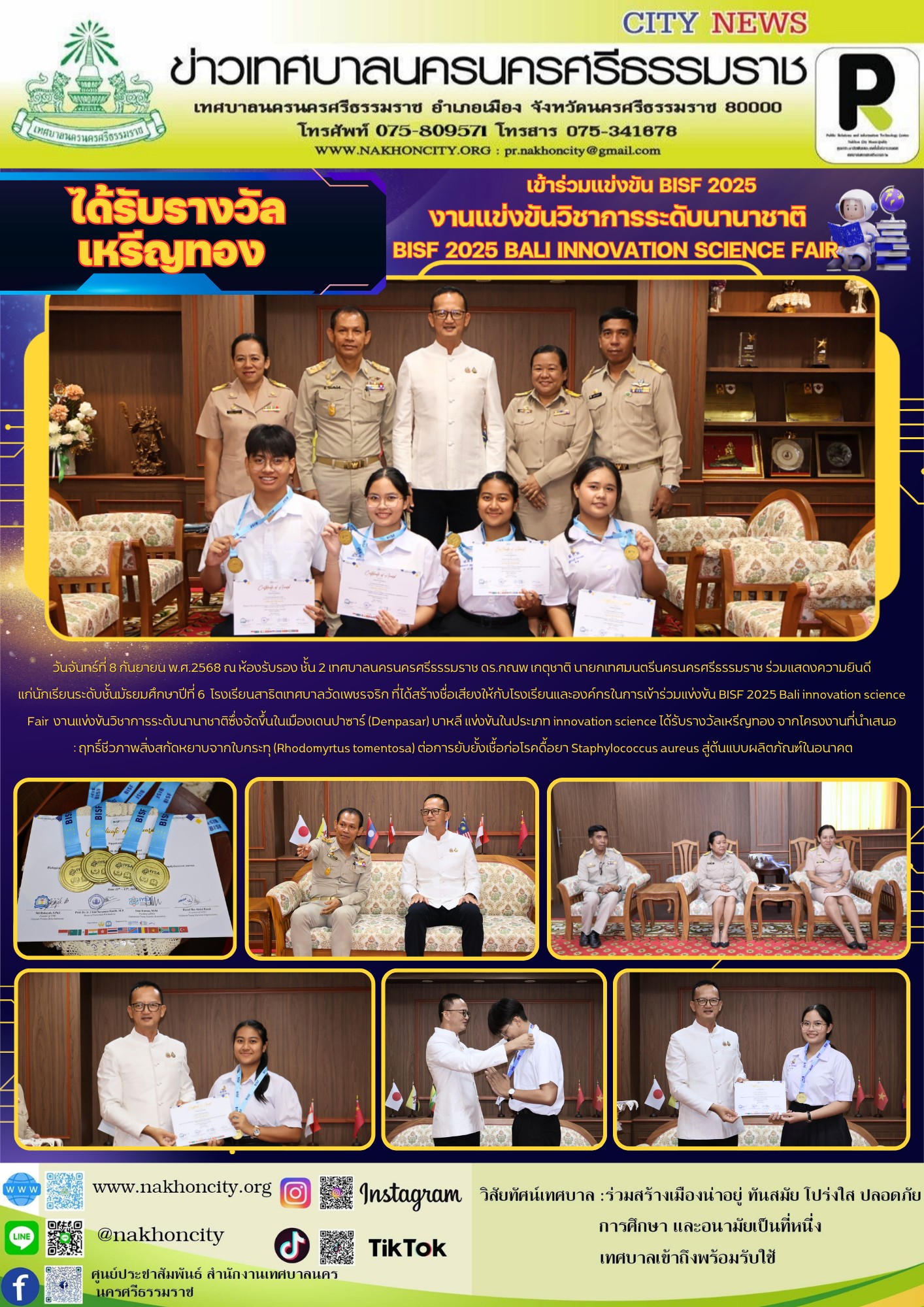 | วันจันทร์ที่ 8 กันยายน พ.ศ.2568 ณ ห้องรับรอง ชั้น 2 เทศบาลนครนครศรีธรรมราช ดร.กณพ เกตุชาติ นายกเทศมนตรีนครนครศรีธรรมราช ร่วมแสดงความยินดีแก่นักเรียนระดับชั้นมัธยมศึกษาปีที่ 6 โรงเรียนสาธิตเทศบาลวัดเพชรจริก ที่ได้สร้างชื่อเสียงให้กับโรงเรียนและองค์กรในการเข้าร่วมแข่งขัน BISF 2025 Bali innovation science Fair งานแข่งขันวิชาการระดับนานาชาติซึ่งจัดขึ้นในเมืองเดนปาซาร์ (Denpasar) บาหลี แข่งขันในประเภท innovation science ได้รับรางวัลเหรีญทอง จากโครงงานที่นำเสนอ : ฤทธิ์ชีวภาพสิ่งสกัดหยาบจากใบกระทุ (Rhodomyrtus tomentosa) ต่อการยับยั้งเชื้อก่อโรคดื้อยา Staphylococcus aureus สู่ต้นแบบผลิตภัณฑ์ในอนาคต .............. ภาพ//ข่าว//จันทร์จิรา |