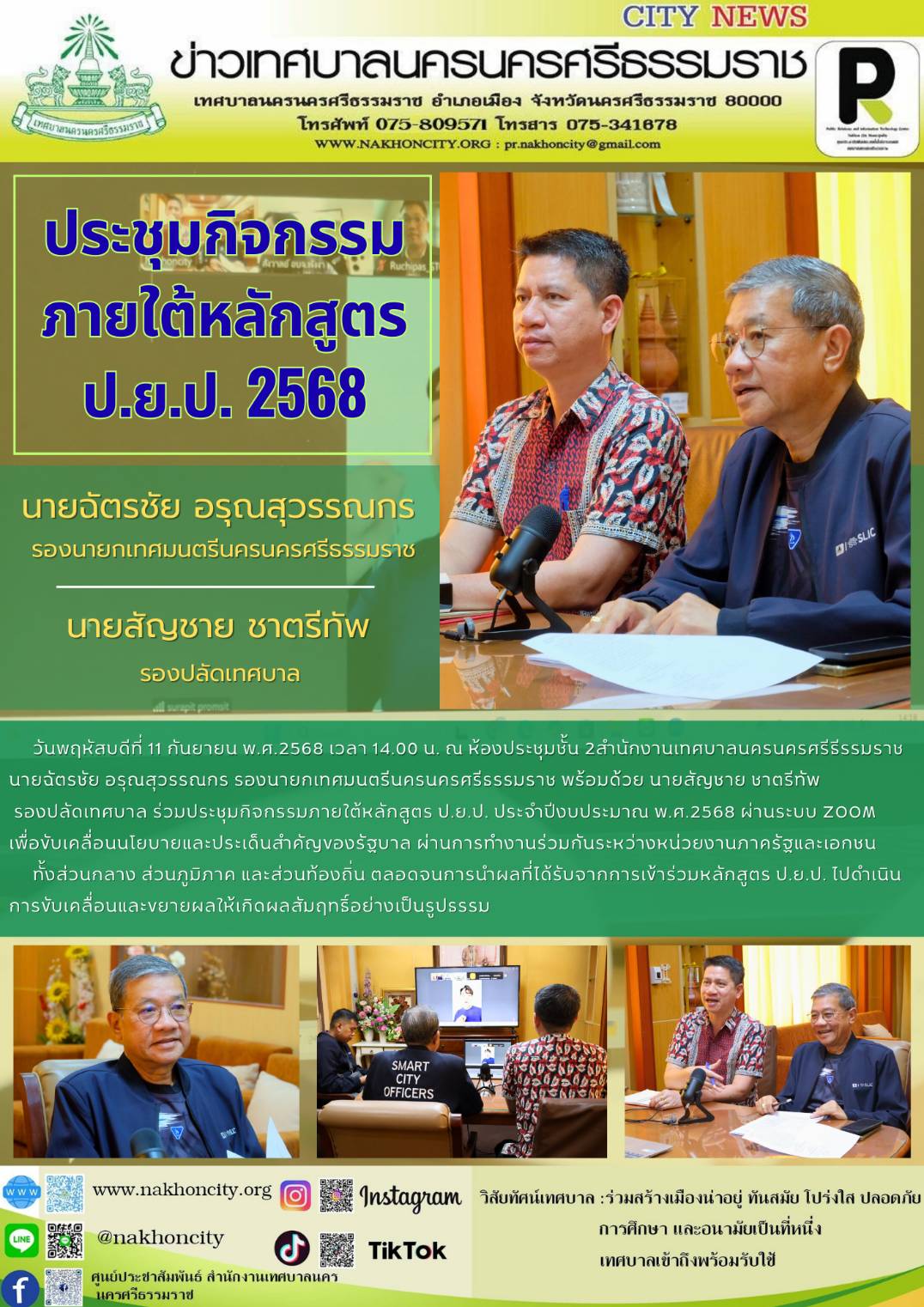 | วันพฤหัสบดีที่ 11 กันยายน พ.ศ.2568 เวลา 14.00 น. ณ ห้องประชุมชั้น 2 สำนักงานเทศบาลนครนครศรีธีรรมราช นายฉัตรชัย อรุณสุวรรณกร รองนายกเทศมนตรีนครนครศรีธรรมราช พร้อมด้วย นายสัญชาย ชาตรีทัพ รองปลัดเทศบาล ร่วมประชุมกิจกรรมภายใต้หลักสูตร ป.ย.ป. ประจำปีงบประมาณ พ.ศ.2568 ผ่านระบบ ZOOM เพื่อขับเคลื่อนนโยบายและประเด็นสำคัญของรัฐบาล ผ่านการทำงานร่วมกันระหว่างหน่วยงานภาครัฐและเอกชน ทั้งส่วนกลาง ส่วนภูมิภาค และส่วนท้องถิ่น ตลอดจนการนำผลที่ได้รับจากการเข้าร่วมหลักสูตร ป.ย.ป. ไปดำเนินการขับเคลื่อนและขยายผลให้เกิดผลสัมฤทธิ์อย่างเป็นรูปธรรม ................. ภาพ//ข่าว//จันทร์จิรา ตรวจทาน//ฐิตินันท์ |