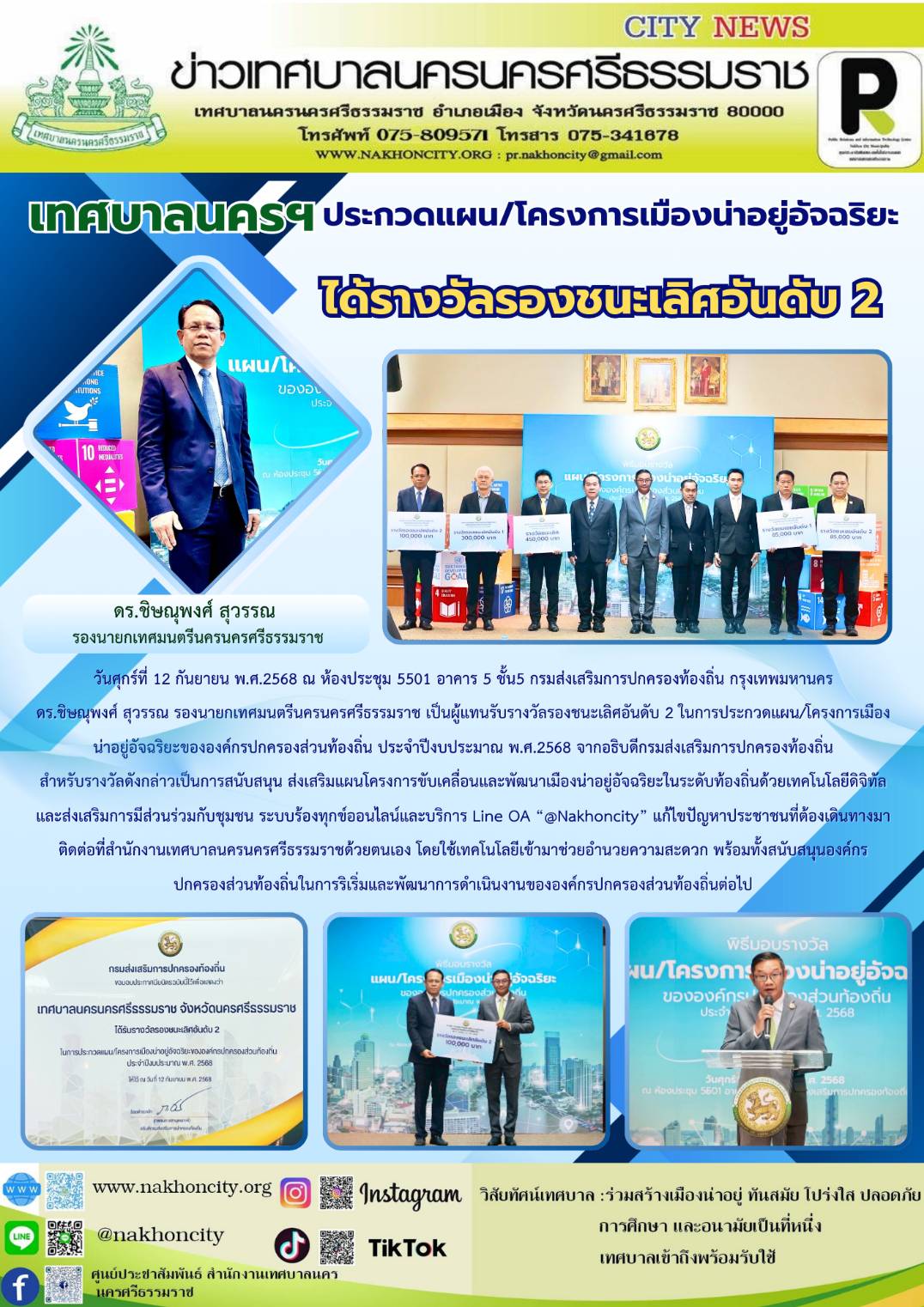 | วันศุกร์ที่ 12 กันยายน พ.ศ.2568 ณ ห้องประชุม 5501 อาคาร 5 ชั้น5 กรมส่งเสริมการปกครองท้องถิ่น กรุงเทพมหานคร ดร.ชิษณุพงศ์ สุวรรณ รองนายกเทศมนตรีนครนครศรีธรรมราช เป็นผู้แทนรับรางวัลรองชนะเลิศอันดับ 2 ในการประกวดแผน/โครงการเมืองน่าอยู่อัจฉริยะขององค์กรปกครองส่วนท้องถิ่น ประจำปีงบประมาณ พ.ศ.2568 จากอธิบดีกรมส่งเสริมการปกครองท้องถิ่น สำหรับรางวัลดังกล่าวเป็นการสนับสนุน ส่งเสริมแผนโครงการขับเคลื่อนและพัฒนาเมืองน่าอยู่อัจฉริยะในระดับท้องถิ่นด้วยเทคโนโลยีดิจิทัลและส่งเสริมการมีส่วนร่วมกับชุมชน ระบบร้องทุกข์ออนไลน์และบริการ Line OA “@Nakhoncity” แก้ไขปัญหาประชาชนที่ต้องเดินทางมาติดต่อที่สำนักงานเทศบาลนครนครศรีธรรมราชด้วยตนเอง โดยใช้เทคโนโลยีเข้ามาช่วยอำนวยความสะดวก พร้อมทั้งสนับสนุนองค์กรปกครองส่วนท้องถิ่นในการริเริ่มและพัฒนาการดำเนินงานขององค์กรปกครองส่วนท้องถิ่นต่อไป ........... ข่าว//จันทร์จิรา ตรวจทาน//ฐิตินันท์ |