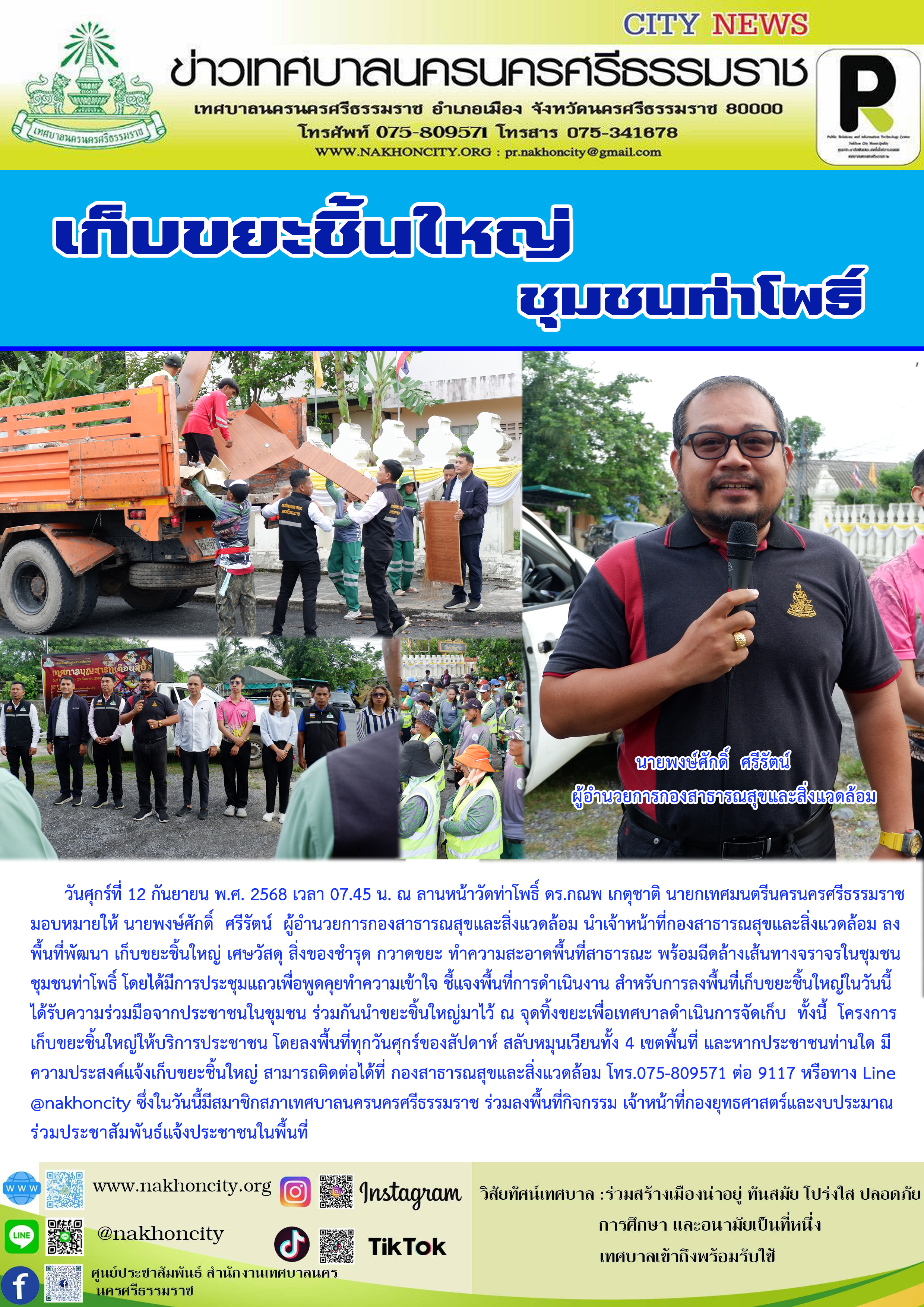 | วันศุกร์ที่ 12 กันยายน พ.ศ. 2568 เวลา 07.45 น. ณ ลานหน้าวัดท่าโพธิ์ ดร.กณพ เกตุชาติ นายกเทศมนตรีนครนครศรีธรรมราช มอบหมายให้ นายพงษ์ศักดิ์ ศรีรัตน์ ผู้อำนวยการกองสาธารณสุขและสิ่งแวดล้อม นำเจ้าหน้าที่กองสาธารณสุขและสิ่งแวดล้อม ลงพื้นที่พัฒนา เก็บขยะชิ้นใหญ่ เศษวัสดุ สิ่งของชำรุด กวาดขยะ ทำความสะอาดพื้นที่สาธารณะ พร้อมฉีดล้างเส้นทางจราจรในชุมชน ชุมชนท่าโพธิ์ โดยได้มีการประชุมแถวเพื่อพูดคุยทำความเข้าใจ ชี้แจงพื้นที่การดำเนินงาน สำหรับการลงพื้นที่เก็บขยะชิ้นใหญ่ในวันนี้ได้รับความร่วมมือจากประชาชนในชุมชน ร่วมกันนำขยะชิ้นใหญ่มาไว้ ณ จุดทิ้งขยะ เพื่อเทศบาลดำเนินการจัดเก็บ ทั้งนี้ โครงการเก็บขยะชิ้นใหญ่ จะให้บริการประชาชน โดยลงพื้นที่ทุกวันศุกร์ของสัปดาห์ สลับหมุนเวียนทั้ง 4 เขตพื้นที่ สามารถติดตามรายละเอียดของกิจกรรมได้ทาง Facebook Page ศูนย์ประชาสัมพันธ์ สำนักงานเทศบาลนครนครศรีธรรมราช และหากประชาชนท่านใด มีความประสงค์แจ้งเก็บขยะชิ้นใหญ่ สามารถติดต่อได้ที่ กองสาธารณสุขและสิ่งแวดล้อม โทร.075-809571 ต่อ 9117 ซึ่งในวันนี้ มีสมาชิกสภาเทศบาลนครนครศรีธรรมราช ร่วมลงพื้นที่กิจกรรม เจ้าหน้าที่กองยุทธศาสตร์และงบประมาณร่วมประชาสัมพันธ์แจ้งประชาชนในพื้นที่ |