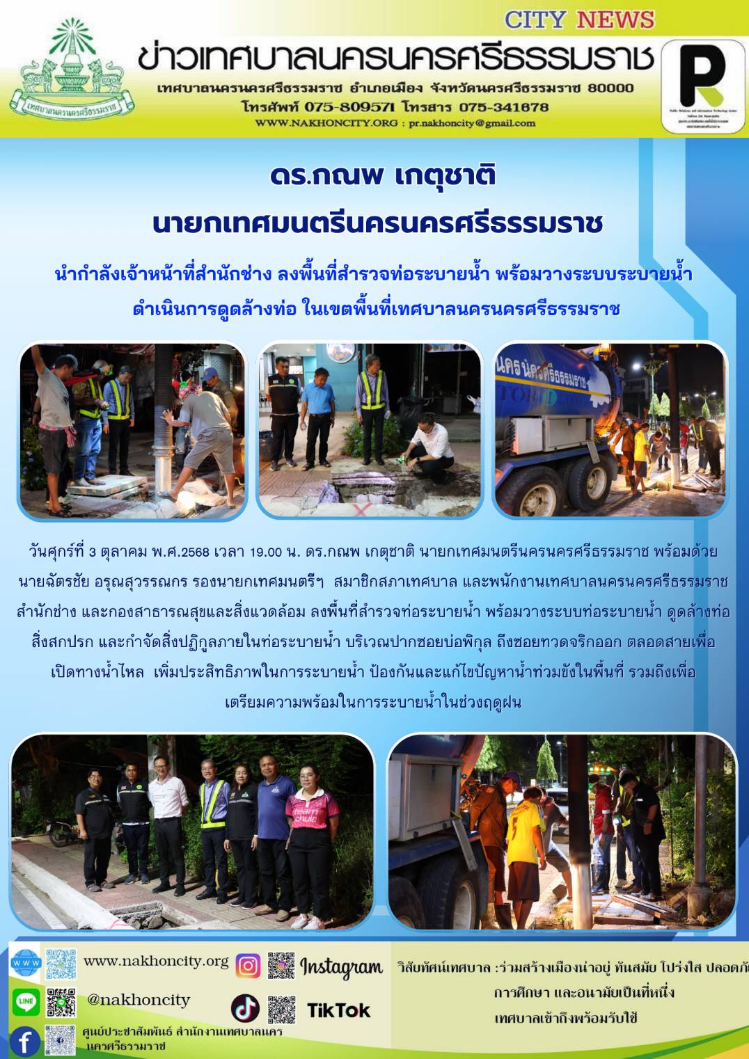 | ดร.กณพ เกตุชาติ นายกเทศมนตรีนครนครศรีธรรมราช นำเจ้าหน้าที่สำนักช่าง ลงพื้นที่สำรวจท่อระบายน้ำ ดำเนินการดูดล้างท่อ ในเขตเทศบาลนครนครศรีธรรมราช |