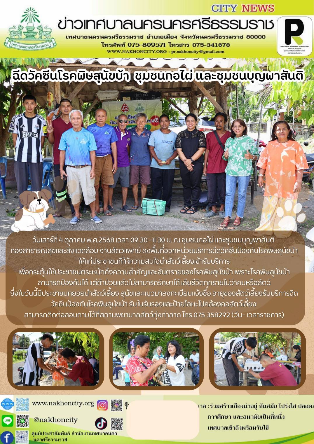 | วันเสาร์ที่ 4 ตุลาคม พ.ศ.2568 เวลา 09.30 -11.30 น. ณ ชุมชนกอไผ่ และชุมชนบุญพาสันติ กองสาธารณสุขและสิ่งแวดล้อม งานสัตวแพทย์ ลงพื้นที่ออกหน่วยบริการฉีดวัคซีนป้องกันโรคพิษสุนัขบ้า ให้แก่ประชาชนที่ให้ความสนใจนำสัตว์เลี้ยงเข้ารับบริการ เพื่อกระตุ้นให้ประชาชนตระหนักถึงความสำคัญและอันตรายของโรคพิษสุนัขบ้า เพราะโรคพิษสุนัขบ้าสามารถป้องกันได้ แต่ถ้าป่วยแล้วไม่สามารถรักษาได้ เสียชีวิตทุกรายไม่ว่าคนหรือสัตว์ ซึ่งในวันนี้มีประชาชนทยอยนำสัตว์เลี้ยง สุนัขและแมวมาลงทะเบียนแจ้งชื่อ อายุของสัตว์เลี้ยงรับบริการฉีดวัคซีนป้องกันโรคพิษสุนัขบ้า รับใบรับรองและป้ายโลหะไปคล้องคอสัตว์เลี้ยง สามารถติดต่อสอบถามได้ที่สถานพยาบาลสัตว์ทุ่งท่าลาด โทร.075 358292 (วัน- เวลาราชการ) ................. ภาพ//ข่าว//จันทร์จิรา |