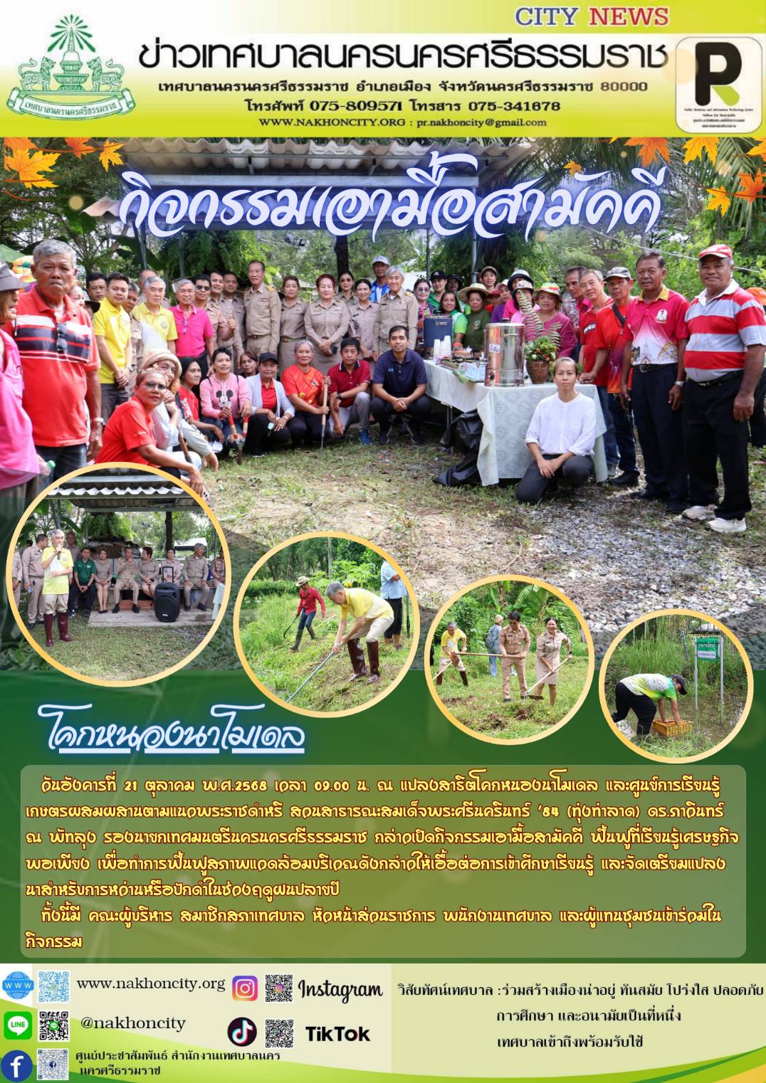 วันอังคารที่ 21 ตุลาคม พ.ศ.2568 เวลา 09.00 น. ณ แปลงสาธิตโคกหนองนาโมเดล และศูนย์การเรียนรู้เกษตรผสมผสานตามแนวพระราชดำหริ สวนสาธารณะสมเด็จพระศรีนครินทร์ ’84 (ทุ่งท่าลาด) ดร.ภาวินทร์ ณ พัทลุง รองนายกเทศมนตรีนครนครศรีธรรมราช กล่าวเปิดกิจกรรมเอามื้อสามัคคี ฟื้นฟูที่เรียนรู้เศรษฐกิจพอเพียง เพื่อทำการฟื้นฟูสภาพแวดล้อมบริเวณดังกล่าวให้เอื้อต่อการเข้าศึกษาเรียนรู้ และจัดเตรียมแปลงนาสำหรับการหว่านหรือปักดำในช่วงฤดูฝนปลายปี ทั้งนี้มี คณะผู้บริหาร สมาชิกสภาเทศบาล หัวหน้าส่วนราชการ พนักงานเทศบาล และผู้แทนชุมชนเข้าร่วมในกิจกรรม ................ ภาพ//ข่าว//จันทร์จิรา ตรวจทาน//ฐิตินันท์ |