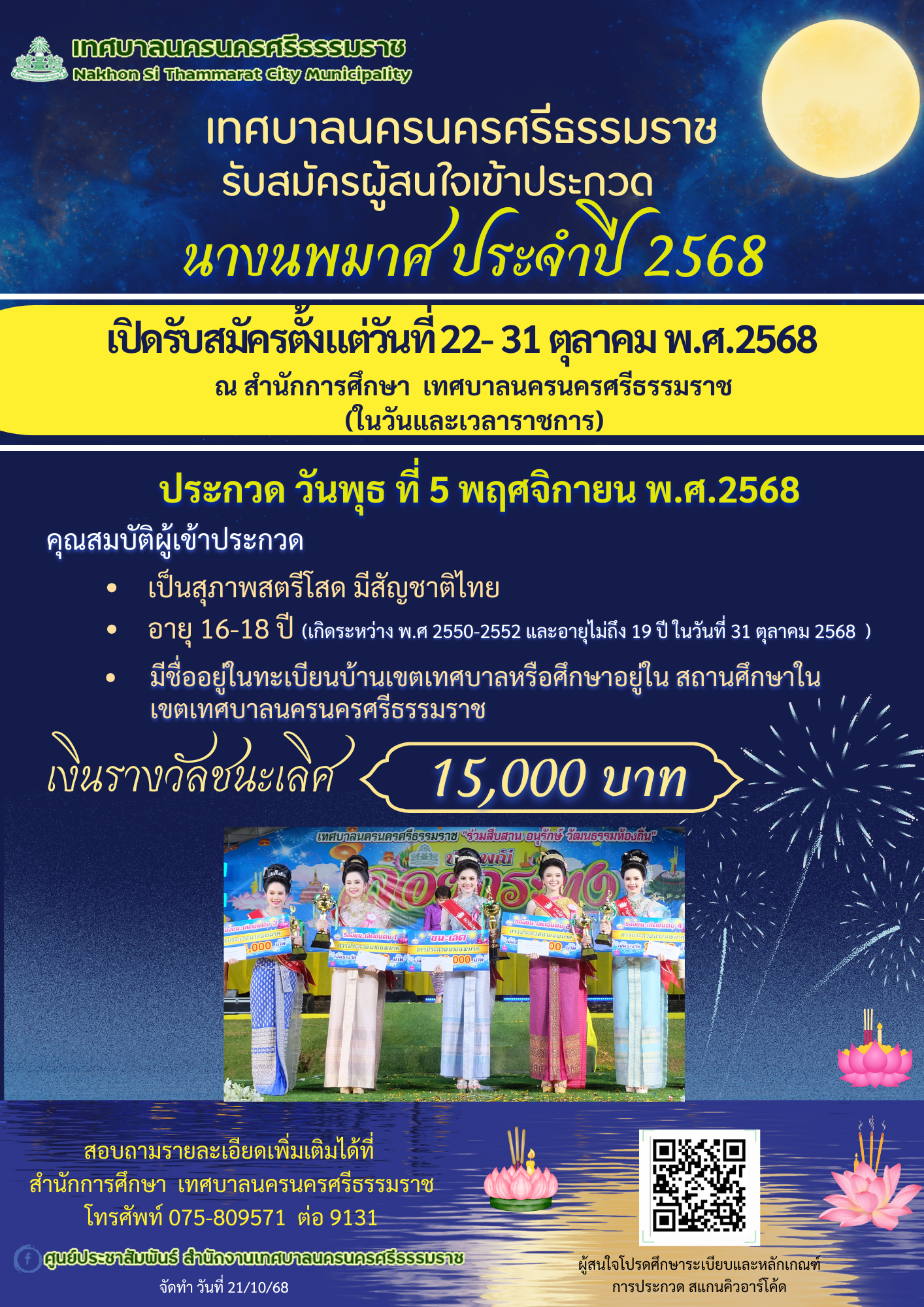 เทศบาลนครนครศรีธรรมราช ขอเชิญผู้สนใจประกวดนางนพมาศ งานประเพณีลอยกระทง ประจำปี 2568 วันพุธ ที่ 5 พฤศจิกายน 2568 ณ สวนสาธารณะศรีธรรมาโศกราชเทศบาลนครนครศรีธรรมราช ระเบียบและหลักเกณฑ์การประกวดนางนพมาศ 1. คุณสมบัติผู้เข้าประกวด 1.1 เป็นสุภาพสตรีโสด มีสัญชาติไทย 1.2 อายุระหว่าง 16 - 18 ปี (เกิดระหว่างปี พ.ศ. 2550 – 2552 และอายุไม่ถึง 19 ปี ในวันที่ 31 ตุลาคม 2568 ) 1.3 มีชื่อในทะเบียนบ้านในเขตเทศบาลนครนครศรีธรรมราช หรือ 1.4 กำลังศึกษา อยู่ในสถานศึกษาในเขตเทศบาลนครนครศรีธรรมราช  2. วัน เวลา สถานที่รับสมัคร 2.1 รับสมัครระหว่าง วันที่ 22-31 ตุลาคม 2568 (ในวันและเวลาราชการ) 2.2 สถานที่รับสมัคร สำนักการศึกษา เทศบาลนครนครศรีธรรมราช โทร 075-809571 ต่อ 9131 2.3 กรณีผู้เข้าประกวดเกินกว่า 20 คน จะมีการคัดเลือกในรอบแรก เหลือเพียง 20 คน ในวันประกวดจริง 2.4 ผู้เข้าประกวดอ่านรายละเอียดหลักเกณฑ์การประกวดให้ครบถ้วนชัดเจน 3. หลักฐานการรับสมัคร 3.1 ใบสมัครตามแบบของเทศบาลนครนครศรีธรรมราช 3.2 ภาพถ่ายของผู้เข้าประกวดขนาด 4 × 6 นิ้ว ขนาดโปสการ์ด จำนวน 1 รูป 3.3 สำเนาทะเบียนบ้าน และสำเนาบัตรประจำตัวประชาชน อย่างละ 1 ฉบับ พร้อมเซ็นต์ชื่อรับรองสำเนาถูกต้อง และนำเอกสารฉบับตัวจริงไปให้เจ้าหน้าที่ตรวจสอบด้วย 3.4 หากหลักฐานไม่ครบตามที่กำหนดจะตัดสิทธิ์การเข้าประกวดทันที 4. การประกาศผลผู้มีสิทธิ์เข้าประกวด ประกาศรายชื่อผู้มีคุณสมบัติครบถ้วน มีสิทธิ์เข้าประกวดในวันจันทร์ ที่ 3 พฤศจิกายน 2568 ณ สำนักการศึกษา เทศบาลนครนครศรีธรรมราช 5. กำหนดวันซ้อมและประกวด 5.1 กำหนดวันซ้อม วันอังคาร ที่ 4 พฤศจิกายน 2568 ผู้สมัครเข้าประกวดนางนพมาศ รายงานตัว ณ สวนสาธารณะศรีธรรมาโศกราช - เวลา 14.30 น. ลงทะเบียนผู้เข้าประกวดนางนพมาศ - เวลา 15.30 น. เตรียมความพร้อม / การซ้อมเดิน 5.2 กำหนดวันประกวด วันพุธ ที่ 5 พฤศจิกายน 2568 ผู้สมัครเข้าประกวดนางนพมาศ รายงานตัว ณ สวนสาธารณะศรีธรรมาโศกราช เวลา 17.00 - 18.00 น. หากพ้นกำหนดเวลาดังกล่าว จะถูกตัดสิทธิ์การเข้าประกวด 6. การแต่งกายของผู้เข้าประกวด 6.1 ให้แต่งกายชุดไทยจักรี รองเท้าที่สวมต้องสูงไม่เกิน 5 นิ้ว 6.2 ทรงผมสวยงามตามความเหมาะสม 7. วิธีดำเนินการประกวด 7.1 สำหรับ “หมายเลข” ผู้สมัครเข้าประกวด ทางคณะกรรมการจะใช้วิธีเรียงลำดับจากการมายื่นใบสมัคร โดยผู้สมัครเข้าประกวดเป็นผู้รับหมายเลขด้วยตนเองในวันรายงานตัว (5 พฤศจิกายน 2568) 7.2 การประกวดรอบที่ 1 ผู้เข้าประกวดเดินโชว์ตัวบนเวทีทุกคน พร้อมแนะนำตัว คณะกรรมการจะพิจารณาคัดเลือก ผู้เข้ารอบ จำนวน 10 คน 7.3 การประกวดรอบที่ 2 ผู้เข้ารอบจำนวน 10 คน แสดงความสามารถพิเศษ (ไม่เกิน 5 นาที) คณะกรรมกา