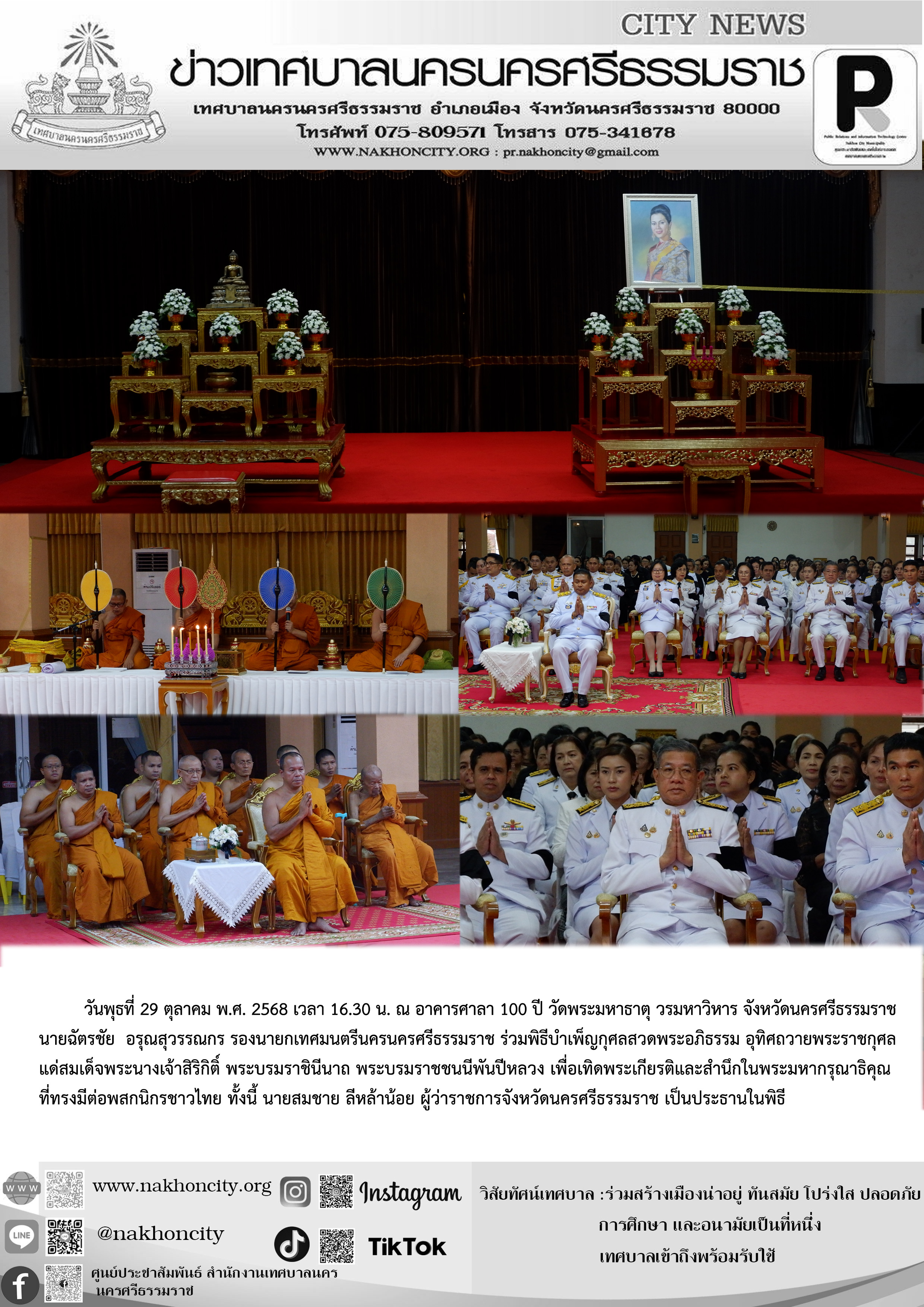วันพุธที่ 29 ตุลาคม พ.ศ. 2568 เวลา 16.30 น. ณ อาคารศาลา 100 ปี วัดพระมหาธาตุ วรมหาวิหาร จังหวัดนครศรีธรรมราช นายฉัตรชัย  อรุณสุวรรณกร รองนายกเทศมนตรีนครนครศรีธรรมราช ร่วมพิธีบำเพ็ญกุศลสวดพระอภิธรรม อุทิศถวายพระราชกุศล แด่สมเด็จพระนางเจ้าสิริกิติ์ พระบรมราชินีนาถ พระบรมราชชนนีพันปีหลวง เพื่อเทิดพระเกียรติและสำนึกในพระมหากรุณาธิคุณ ที่ทรงมีต่อพสกนิกรชาวไทย ทั้งนี้ นายสมชาย ลีหล้าน้อย ผู้ว่าราชการจังหวัดนครศรีธรรมราช เป็นประธานในพิธี
